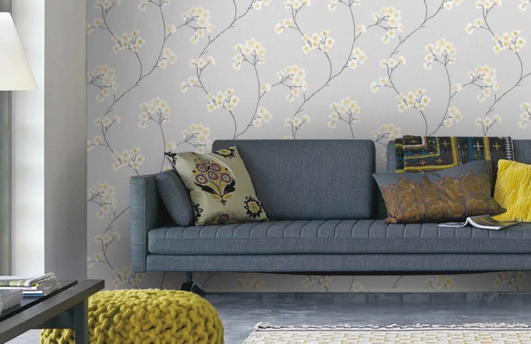 Boasting grey and ochre colours, playful blossom trails add a level of intrigue that makes for a tranquil, Orient-inspired living room.