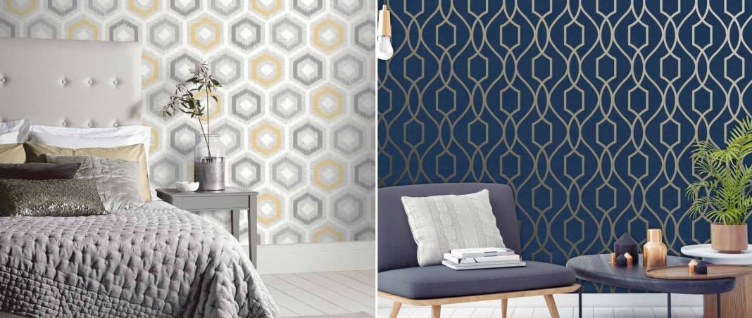 Alternatively this Apex Trellis Navy & Gold wallpaper boasts a navy textured background, finished with a metallic champagne-gold trellis print.