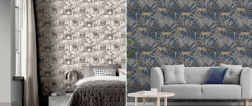 And this Wild Palms Charcoal & Gold design features dramatic monochrome leaves layered with contrasting metallic leaf silhouette, for a contemporary, glamorous finish to any room.