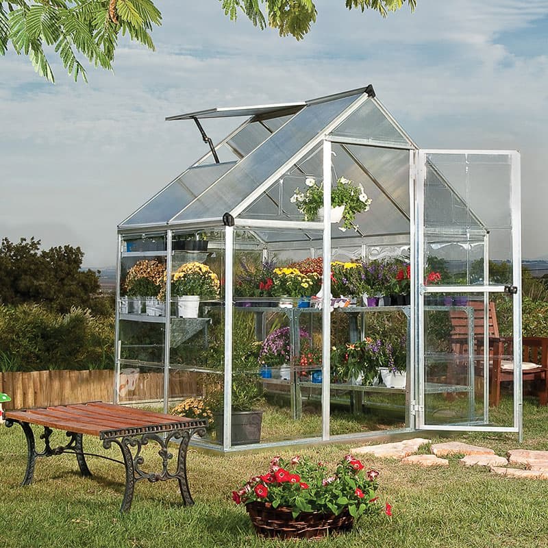 On the aluminium side, our Palram Canopia greenhouses tend to have that classic greenhouse shape: a tall apex roof, a metal frame and clear polycarbonate panels. With sizes as large as 8’ x 20’ (like the 8' x 20' Palram Canopia Balance Green Greenhouse), these greenhouses deliver an unbeatable amount of practical growing space at budget-friendly prices. You can choose between grey, green and silver frames, which will all look right at home among the natural earthy tones of a garden.