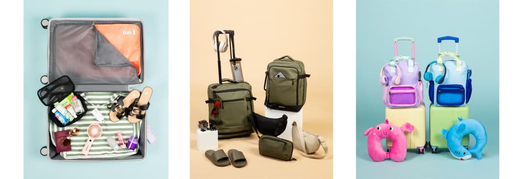To avoid any digital blackouts, be sure to stay connected with holiday electricals and pick up necessary travel adapters, chargers, hand fans, headphones, mini hairstyling tools, and so much more.