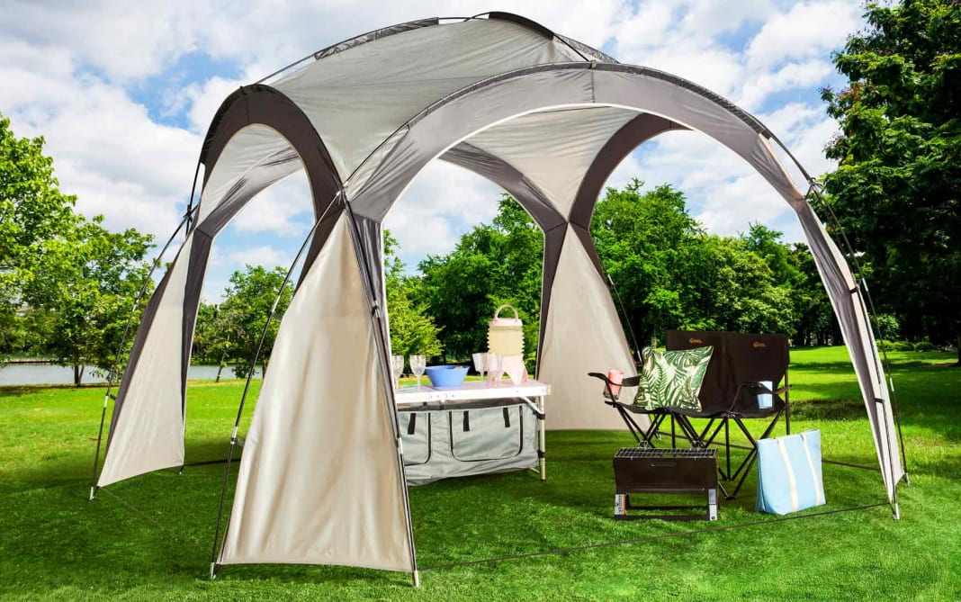 Create a welcoming space by starting with a dome shelter, providing shade during sunny afternoons and a cosy spot to gather as the evening cools. Pair it with a double folding camping chair with cup holders, so everyone can relax comfortably while keeping their drinks within reach.