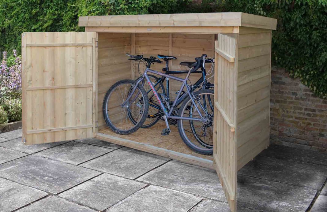The Forest Large Double Door Pent Wooden Bike Store is ideal. Pressure treated and supplied with a 15-year anti-rot guarantee, the traditional overlap construction ensures excellent rainwater runoff. The floor is fitted with pressure-treated bearers, while the roof includes a sand felt cover to keep out the rain.
