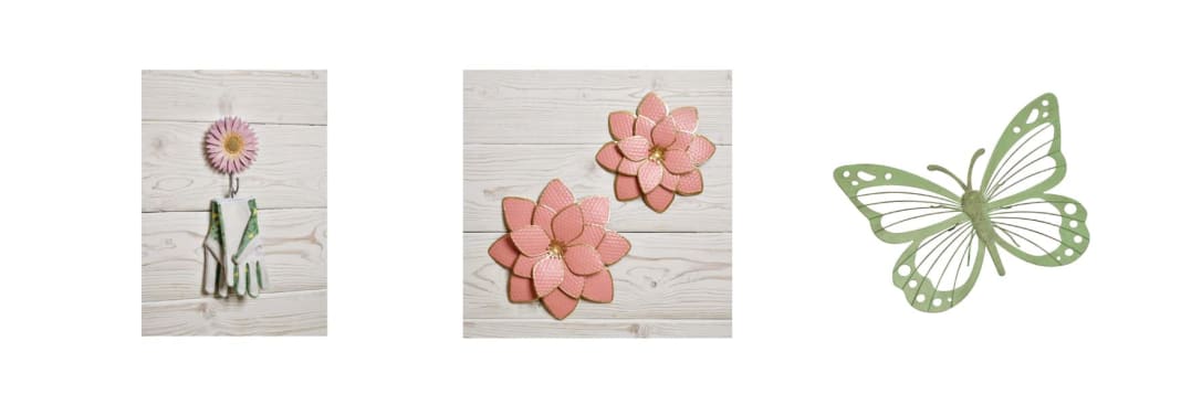 Including pretty-but-practical elements such as wall hooks offer a great way to place additional elements without taking up too much floor space - but you should also feel free to hang attractive plaques and pieces of outdoor art that serve purely aesthetic purposes!