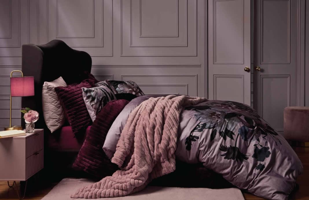 The Velvet Floral Duvet Set features a sumptuous, seasonal design, offering a dramatic Midnight Garden bouquet of intense blush pinks, emerald greens and damson blooms to introduce a wonderfully warming colour scheme.