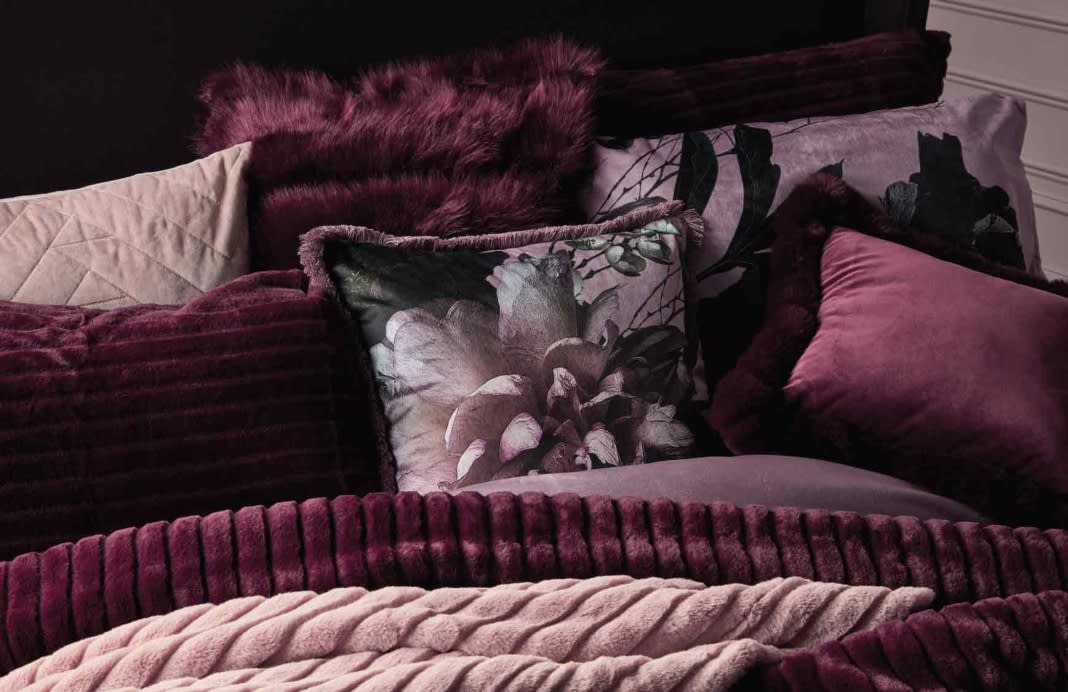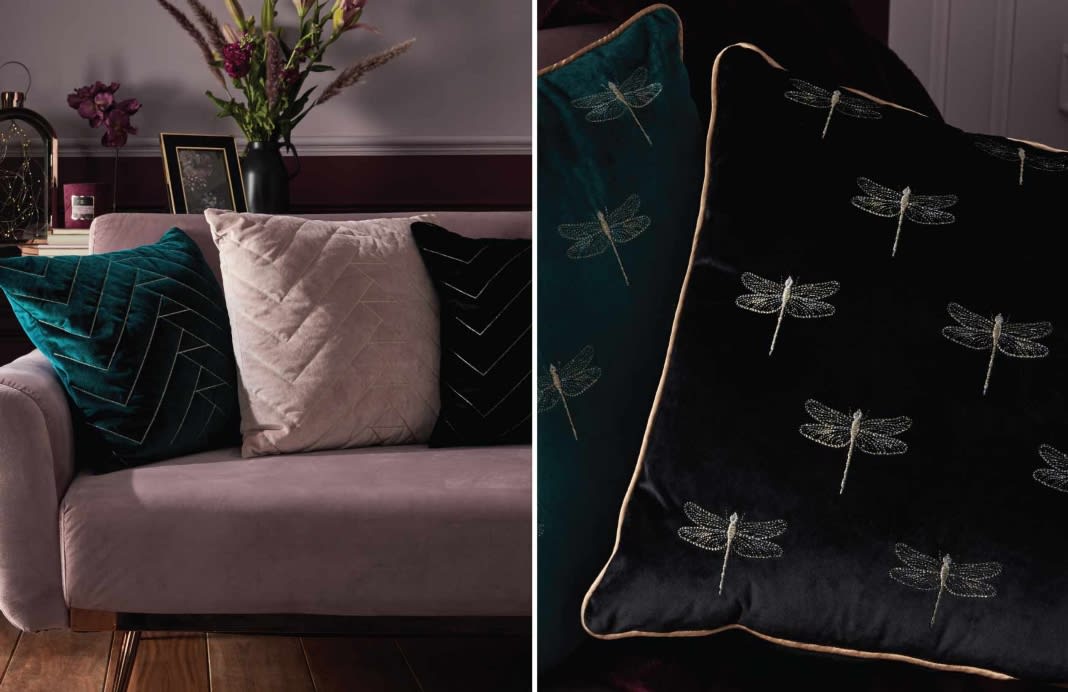 The Nova Floral Cushion offers a striking finishing touch to your Midnight Garden bedroom, in a beautiful, matching design. While the Dakota Faux Fur Cushion brings sumptuous comfort in opulent Plum. The Liberty Cushion in this season’s key shade of Blush, features gold stitching detail, adding a timeless Art Deco appeal. For another eye-catching addition, the Paradise Dragonfly Cushion in Black or Teal, offers a striking motif with distinct gold edging.