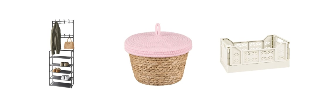 Free-standing shelving, clever combination coat hooks and shoe stands and pretty baskets can add to the design of your space while providing you with more storage.