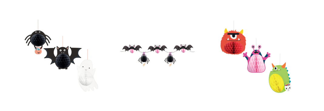 Honeycomb Halloween decorations are ideal, as they are lightweight and three-dimensional and there are plenty of creepy-but-cute designs available, such as bats, spiders, ghosts and monsters.