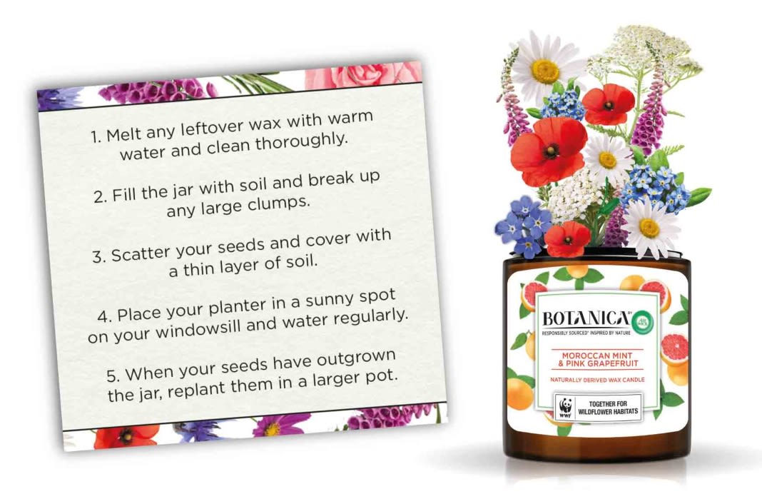 Which is why Botanica by Air Wick has joined forces with WWF to #BringNatureBack: an initiative to restore 20 million sq ft of wildflower habitat across the UK. And you can do your bit too, by creating your own patch, corner, garden or even candle on a window-sill full of meadow! After you’ve picked up your Botanica candle and enjoyed its evocative fragrance, all you need to do is: