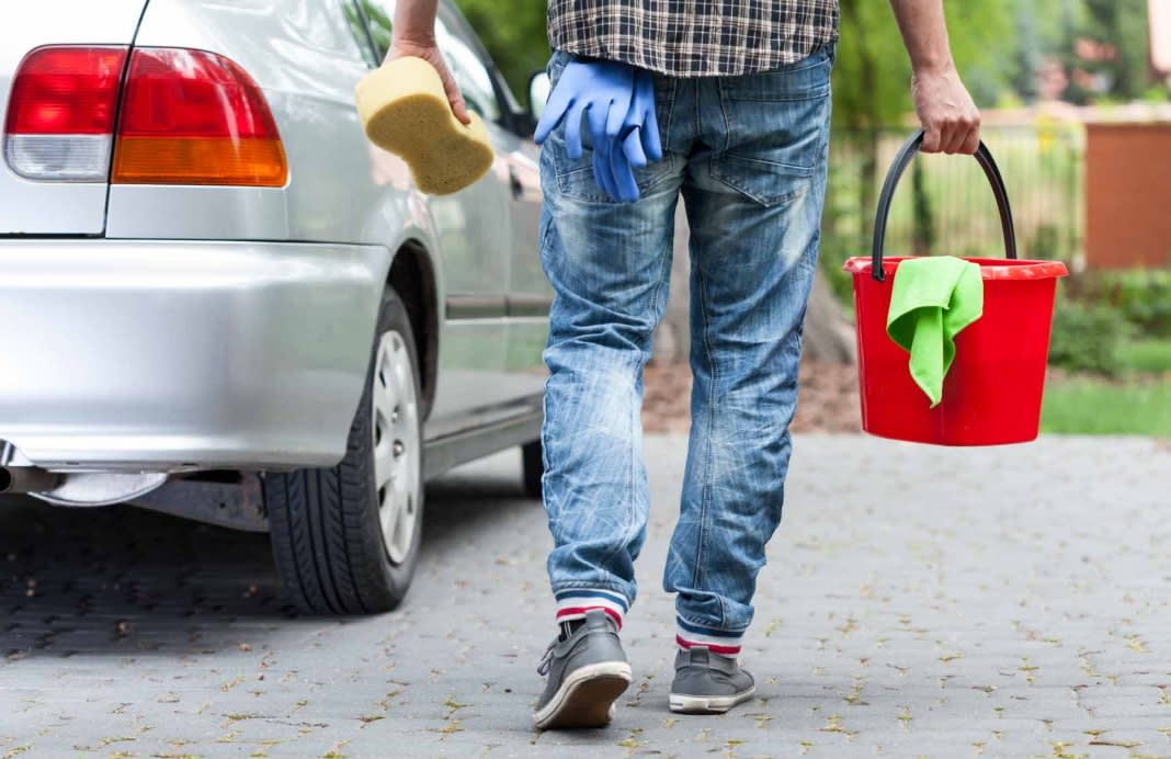 Once you’re done washing the car with sponges and soap, rinse it by throwing the whole bucket of water over the vehicle! Then, just dry it as you normally would.