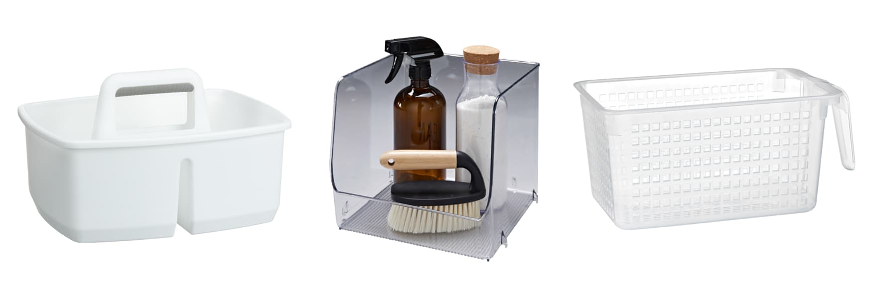 Grab some storage baskets, tubs or trays, depending on your preference, and perfect your cleaning cupboard organisation. We recommend considering the weight of the items you'll be adding to the tub and ensuring a sturdy enough container. The Large Clear Stackable Storage Bin is perfect for heavier items.