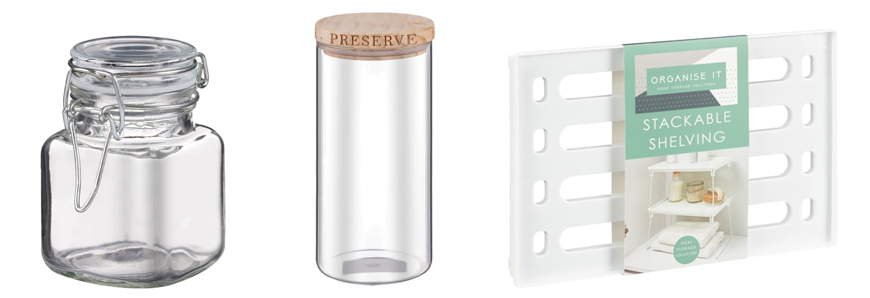 Organise spices with a Clip-Lock Spice Jar to keep them fresh. How to organise your kitchen cupboards depends on what food you're storing. The Large Glass Canister With Wooden Engraved Lid is great for perishables, pasta or anything that needs to be airtight.