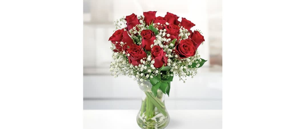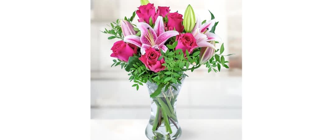 This is a truly elegant floral display that includes perfectly paired stargazer lilies and long-stemmed roses. The sizes, colours, and textures of these flowers both contrast and complement one another.
