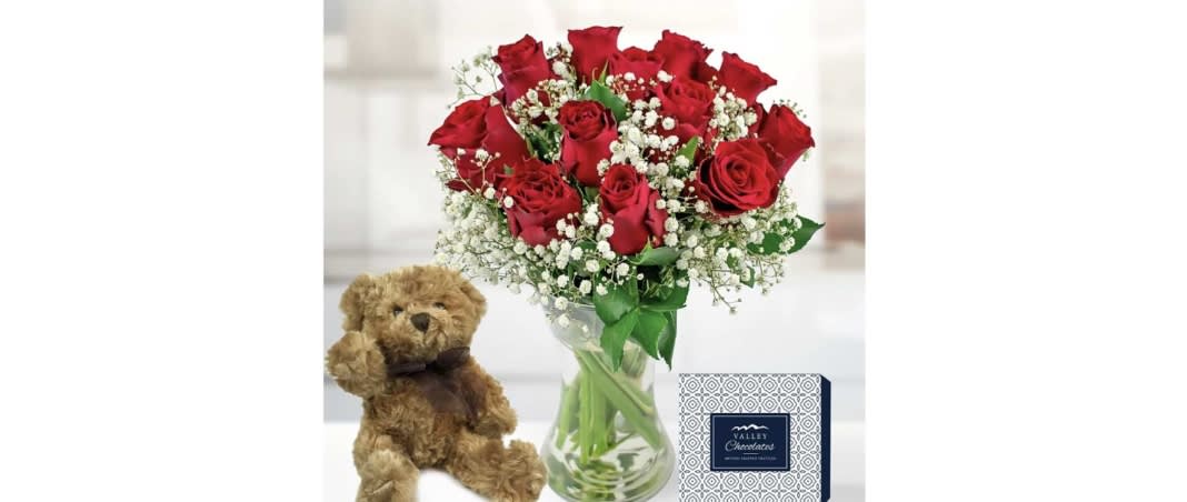 Alongside the striking red bouquet of flowers is a cuddly soft, adorable teddy bear. It’s all you’ll need to remind your partner how much you love them.