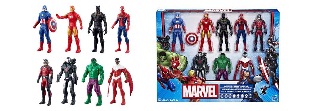 Imagine the action with this pack of 8 Marvel figures, including Hulk, Iron Man, Ant-Man, Black Panther, Captain America, Spider-Man, Marvel's War Machine, and Marvel's Falcon.