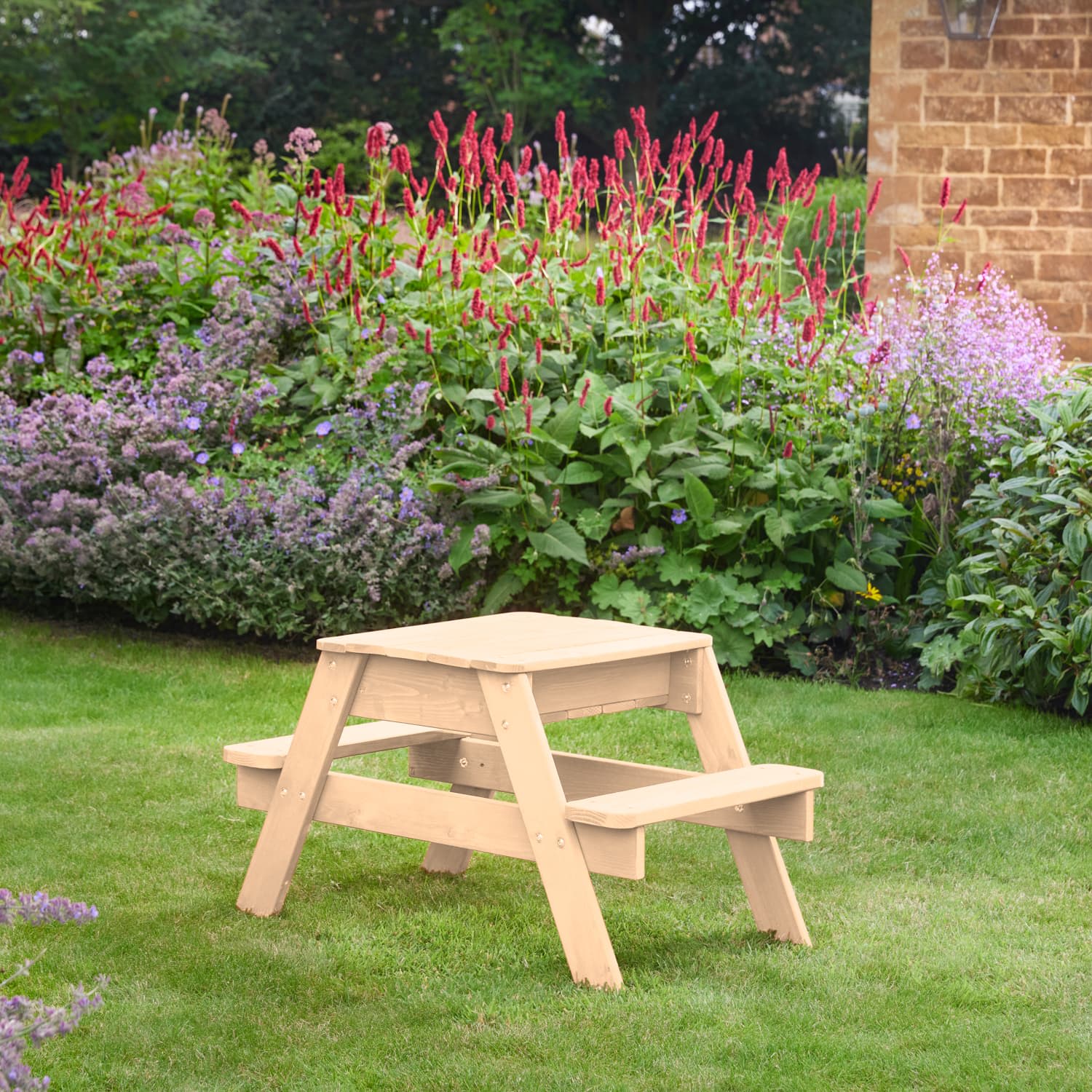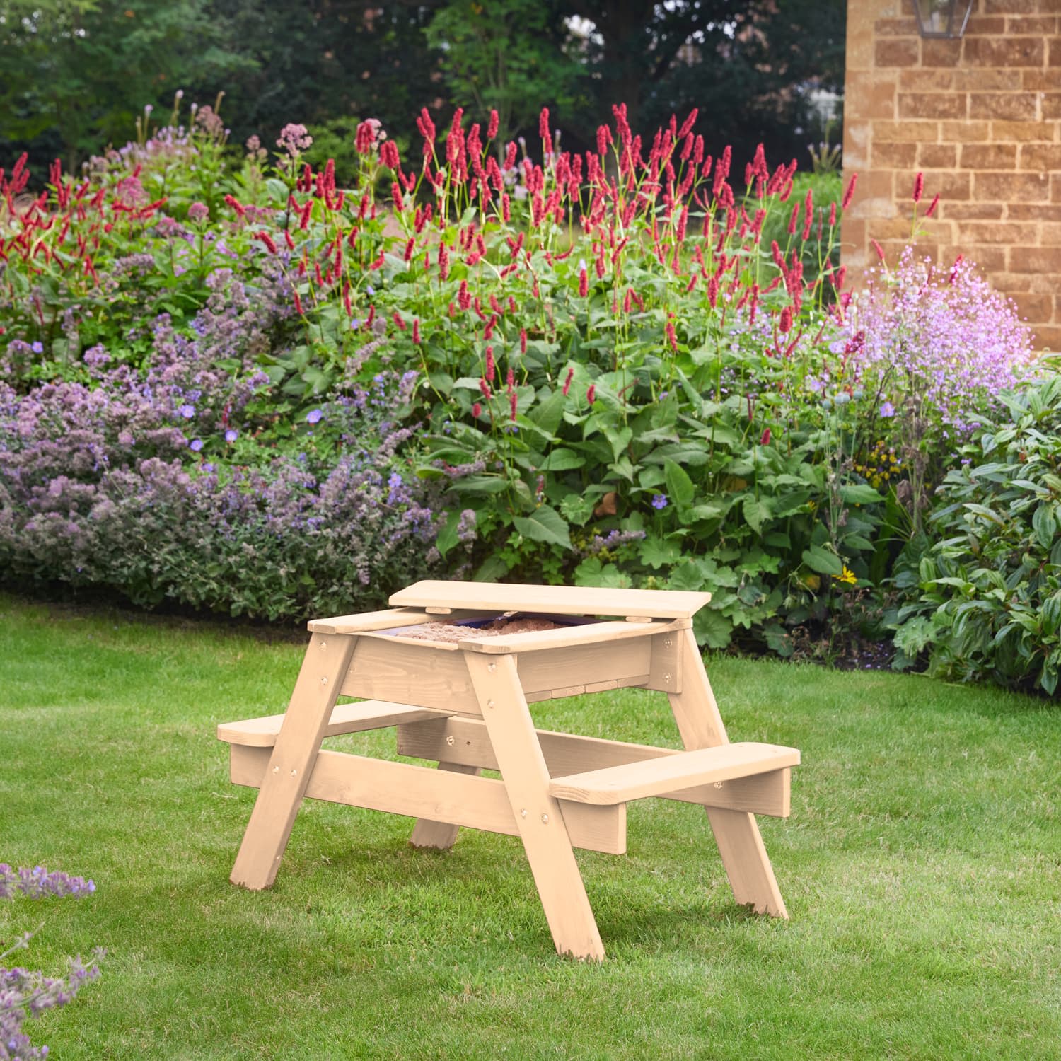Once playtime is done, simply cover the sand with the wooden table-top to transform it into a spacious picnic table, perfect for enjoying snacks outdoor.