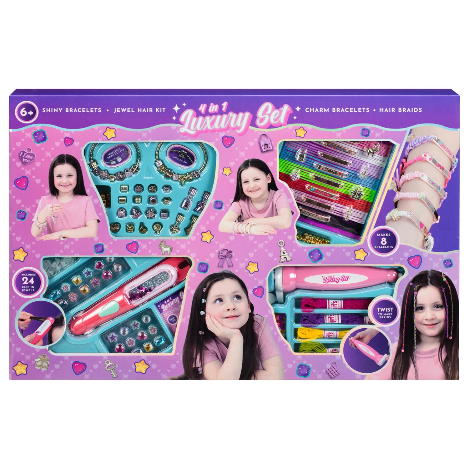 Make shiny bracelets, jewel hair kit, charm bracelets or hair braids.