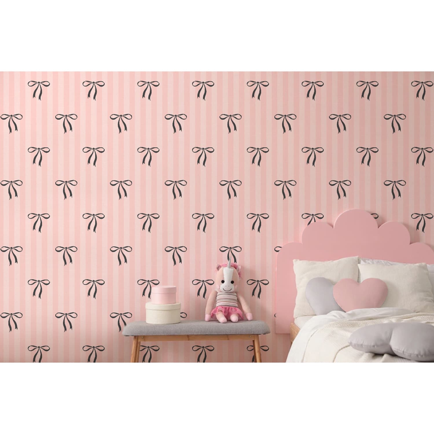 This wallpaper has a delicate bow motif scattered across a background of vertical stripes, creating a sweet, charming design.