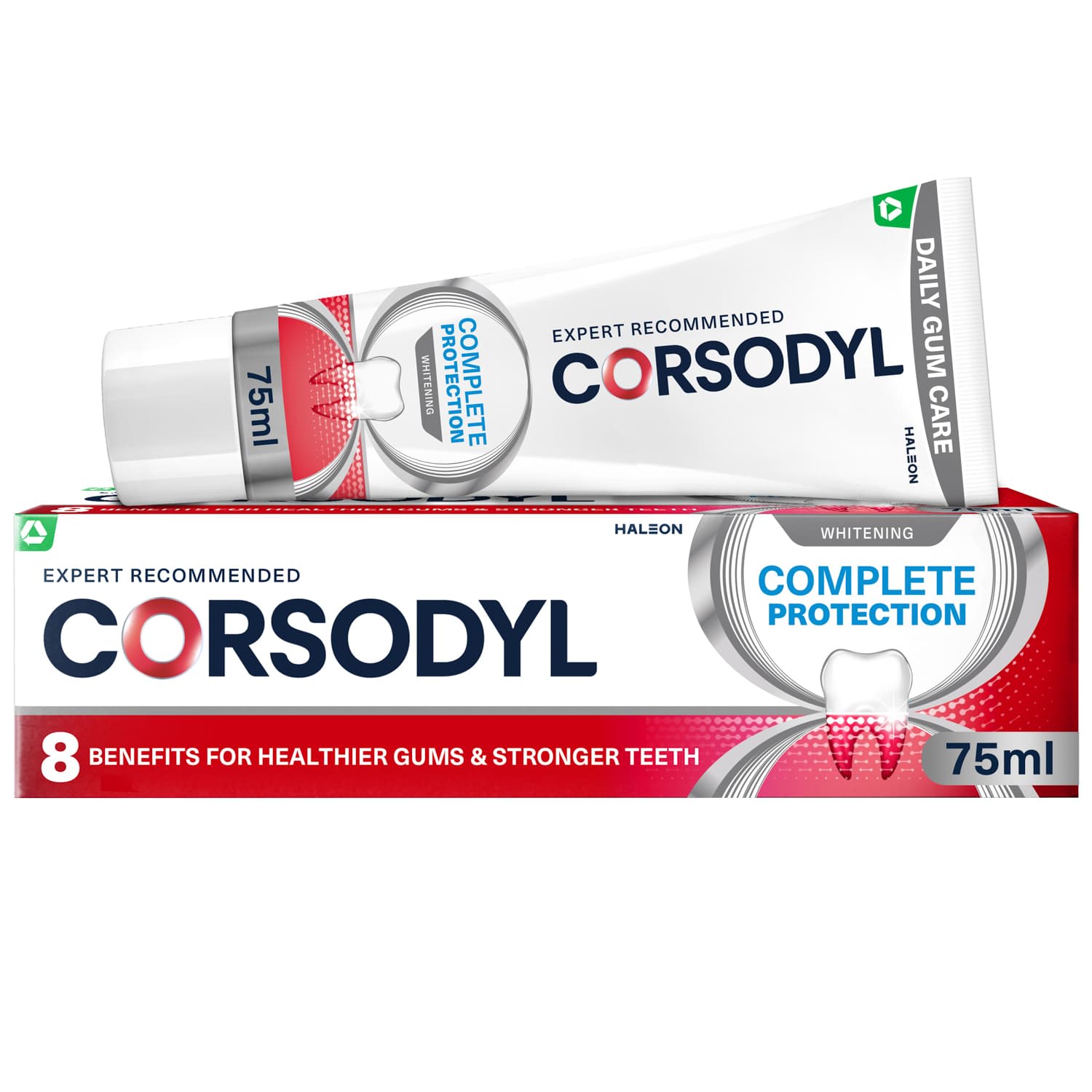 For healthier gums and stronger teeth, you can rely on Corsodyl Complete Protection Whitening Toothpaste.