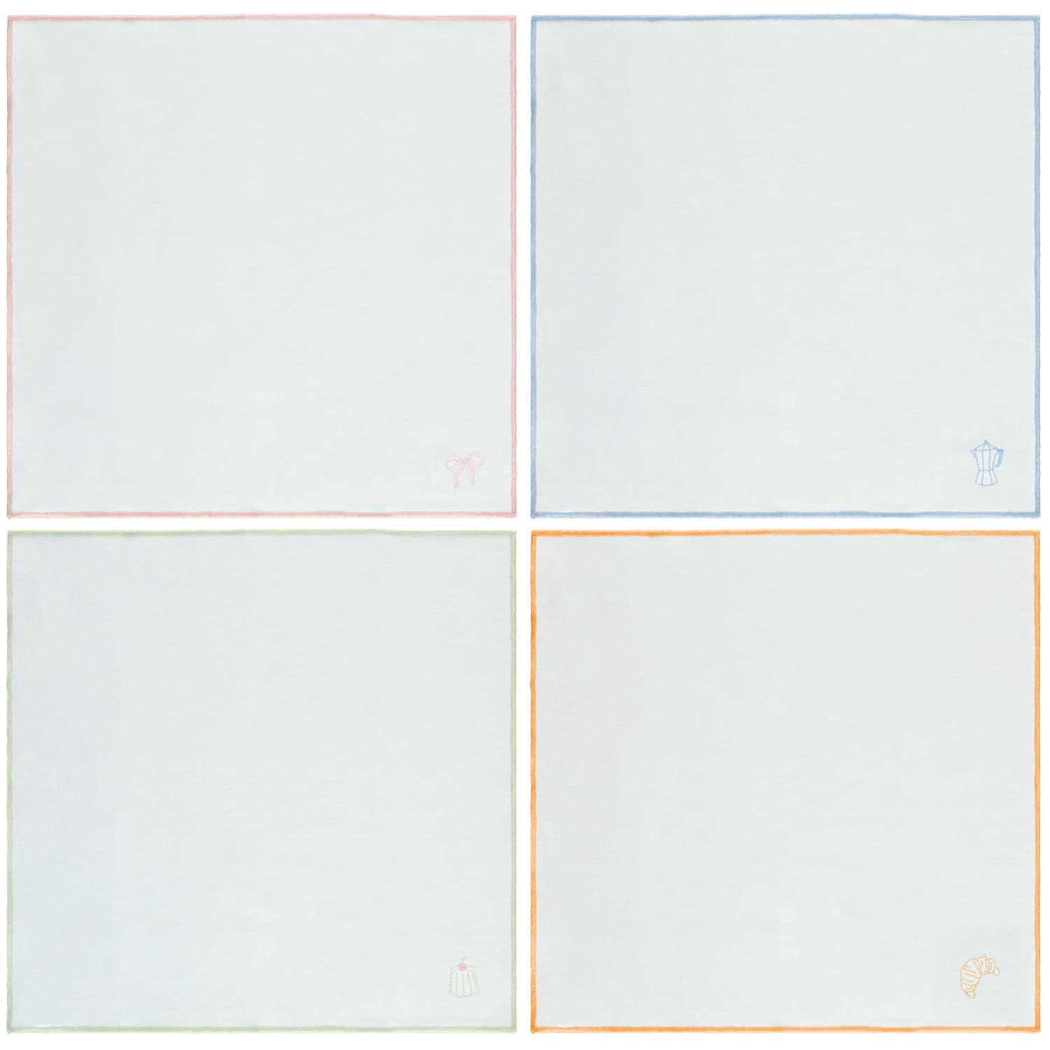 Add a touch of Parisian charm to your tablescape with this 4-pack of Fabric Napkins with Embroidery, each detailed with delicate patisserie inspired motifs like croissants, dainty bows, and more.