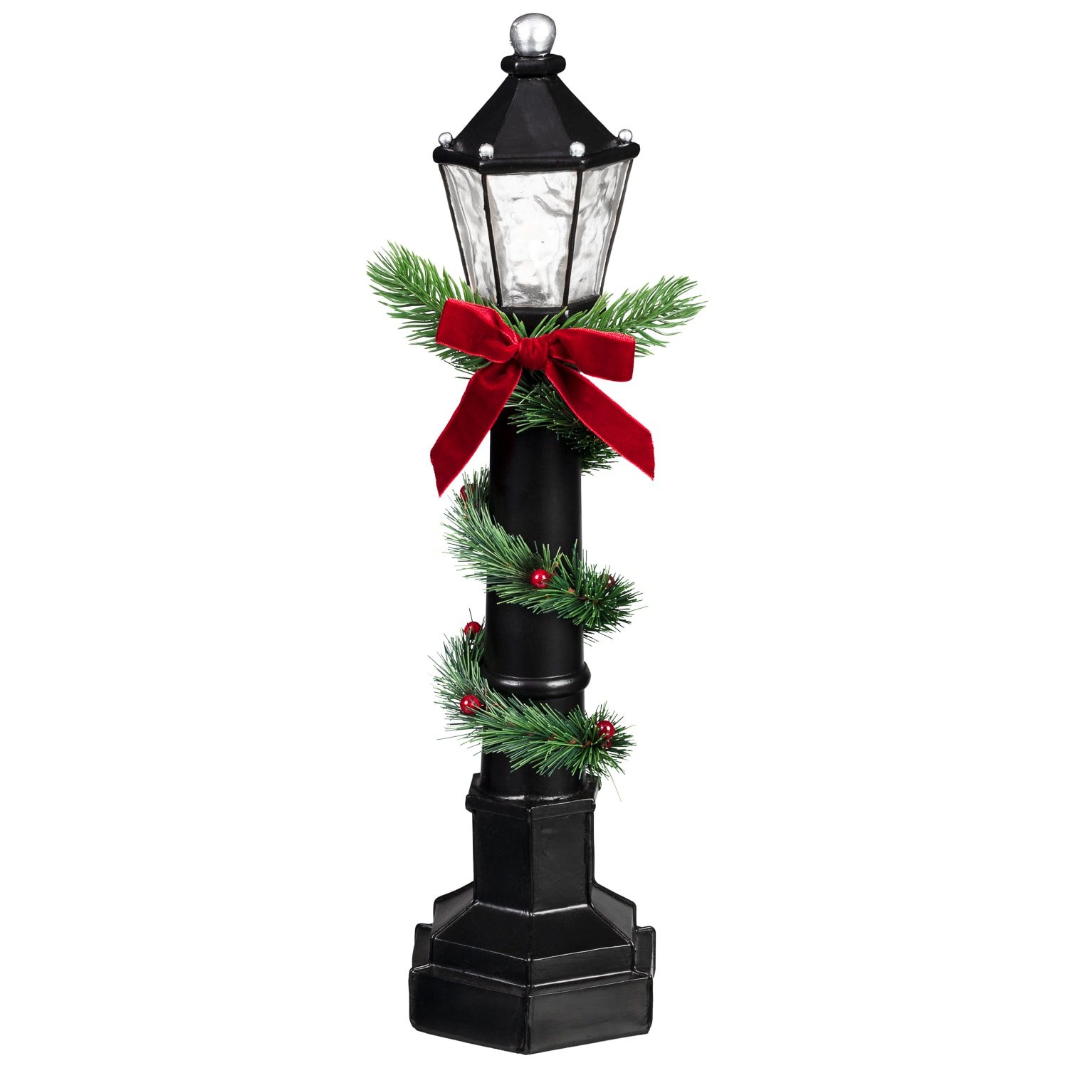 Designed for display around your home, this classic black lamp post is wrapped in green foliage and a bright red ribbon for a timeless look.