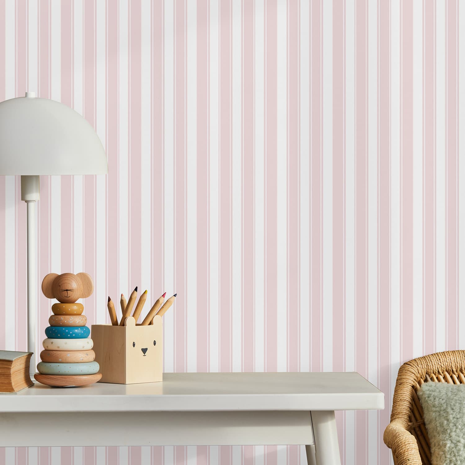 Featuring delicate pink tones arranged in a clean, contemporary stripe pattern, this fresh and versatile wallpaper adds height, structure, and openness to any room.