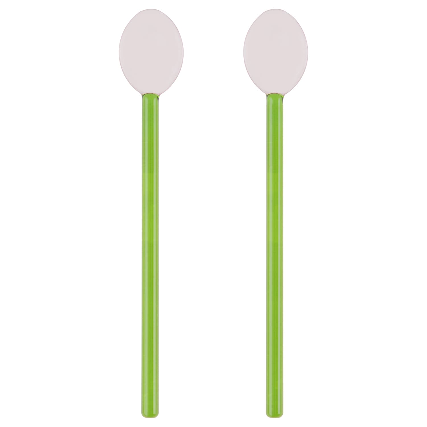 Elevate your home dining experience with this set of two glass spoons, finished with a green tint that is both eye-catching and vibrant.