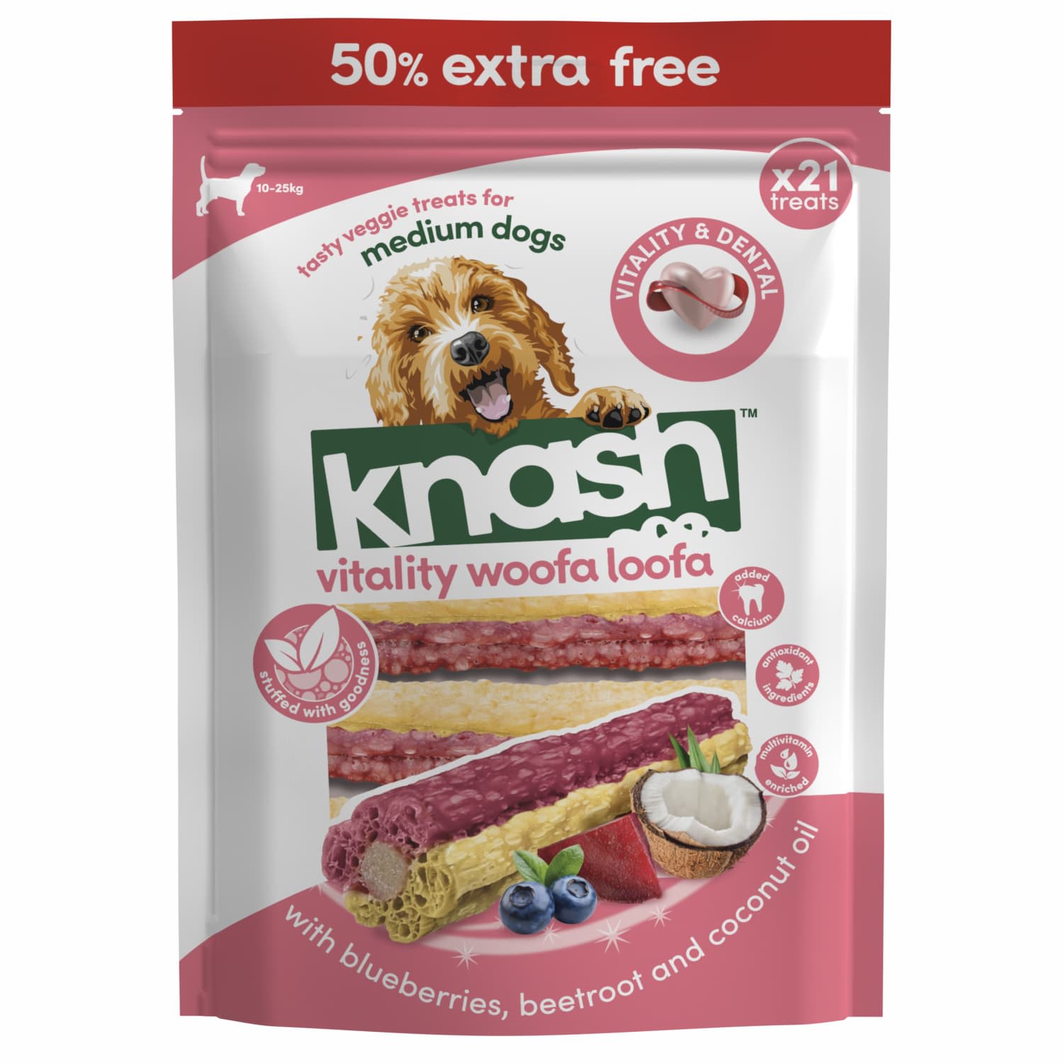 Flavoured with blueberry, beetroot, and coconut, Knash Vitality Woofa Loofa Treats are made with natural ingredients with added calcium for healthy bones and teeth.