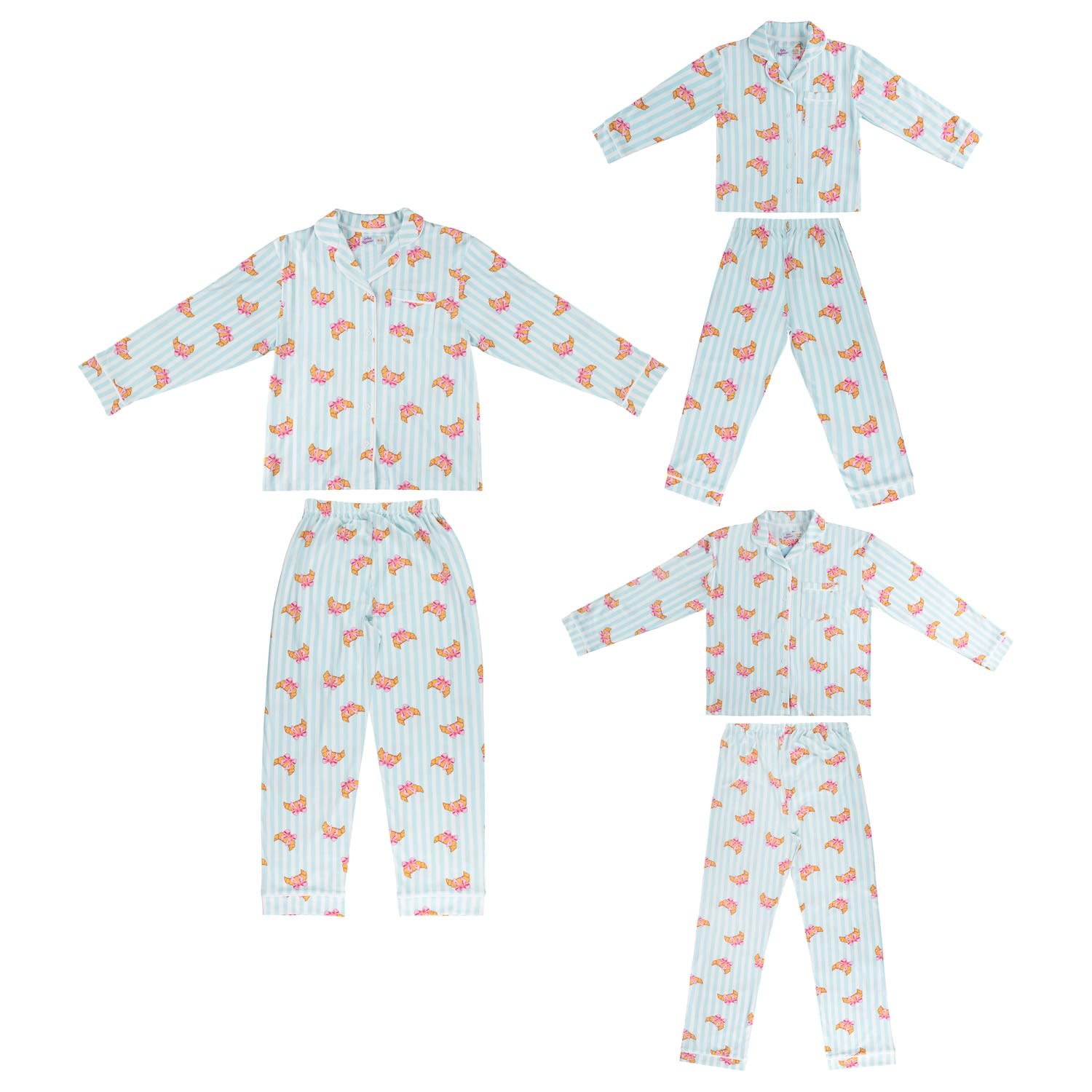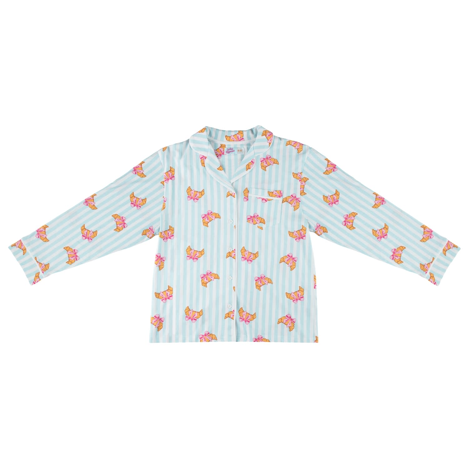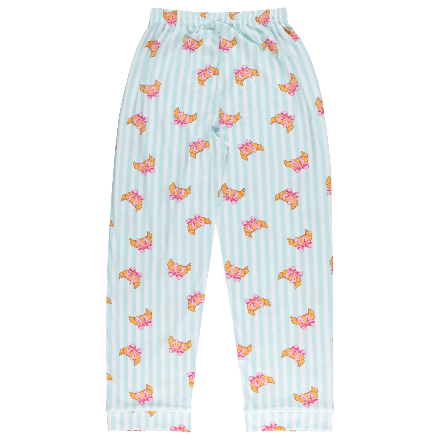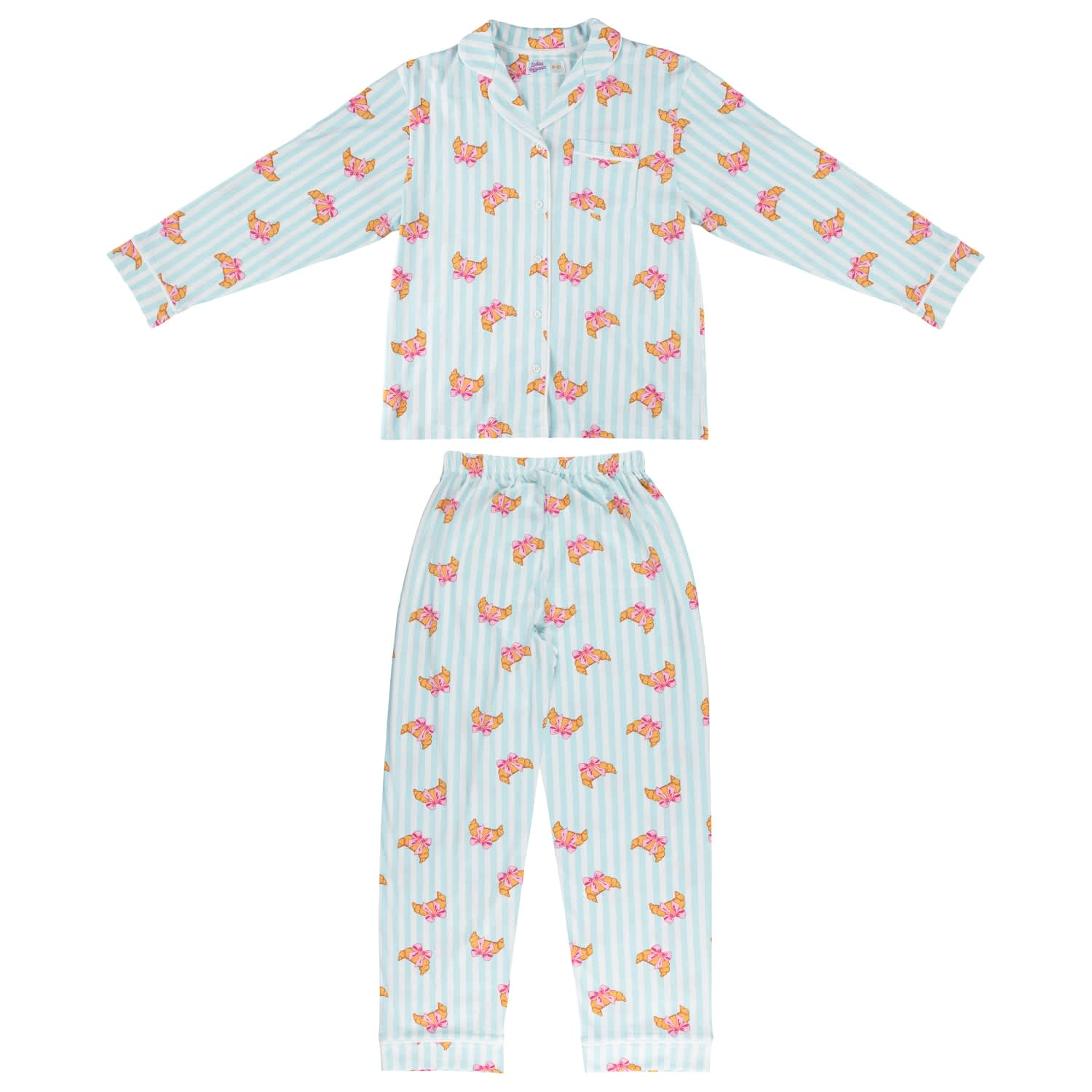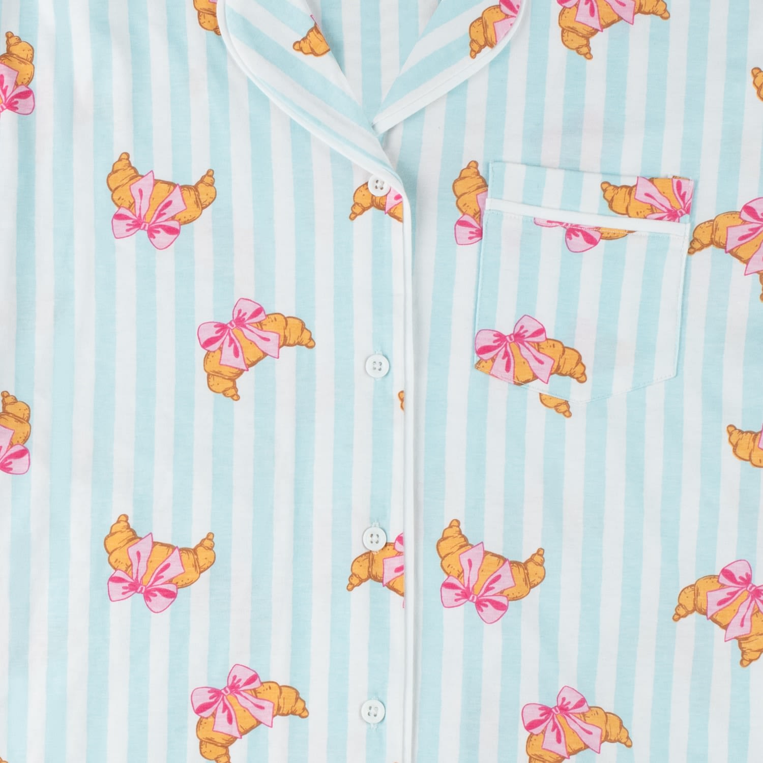 This pyjama set blends comfort with effortless elegance, featuring an on-trend blue and white striped design, adorned with croissants and pink bows.