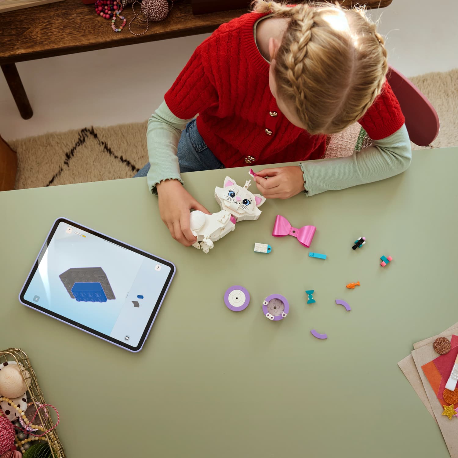 This fun piece of kids' room decor features a brick-built, posable toy cat, made for creative play and a fun display. The building set also includes a brick-built gift box, small mouse, brush, fish and a pink textile bow to inspire endless stories. Kids can also enjoy intuitive building with the LEGO Builder app, zooming and rotating with 3D instructions, while saving and tracking progress.