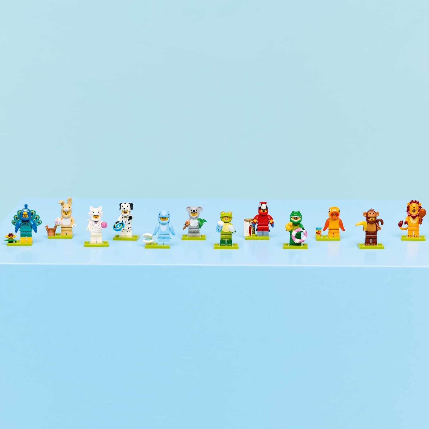 There is 1 surprise LEGO minifigure in each box and a total of 12 characters to collect including toy figures wearing parrot, lion, frog, crocodile, Dalmatian, goldfish, cute bunny, peacock, fluffy cat, koala, dolphin and monkey costumes. Each of the 12 minifigures comes in a sealed mystery box, and all are accompanied by at least 1 accessory.