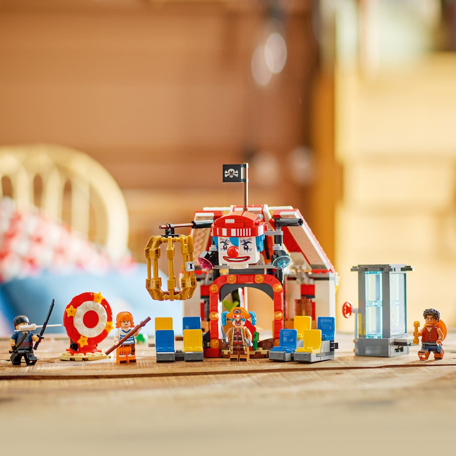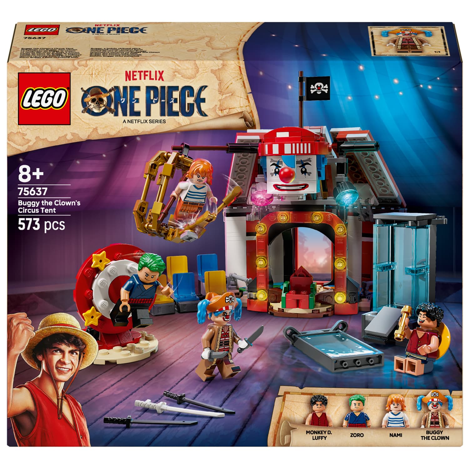 The set comes with minifigures of Luffy, Zoro, Nami and pirate captain Buggy the Clown. The buildable tent can be flipped around to create a larger play area with detachable chair sections and Buggy's throne. There are 3 circus contraptions from which the heroes must escape: a water tank, spinning vertical table and a hanging cage.