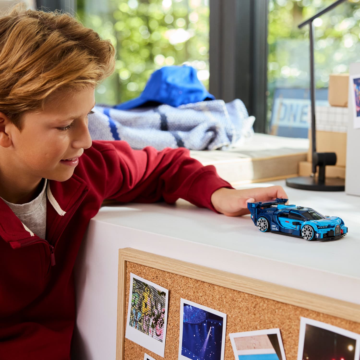 The Bugatti model car includes details from the vehicle created by Bugatti for the Gran Turismo video game in 2015. This includes a horseshoe front grille, rear wing, distinctive 8-eye headlights, a roof fin, and wide tyres imprinted with 'Michelin'. The toy car also includes a LEGO driver mini-figure wearing a Bugatti outfit to place inside the cockpit to enjoy races.