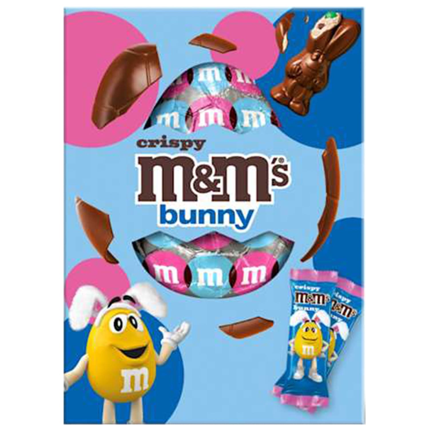 A hollow milk chocolate Easter egg complete with two M&M's Crispy Chocolate Bunnies.