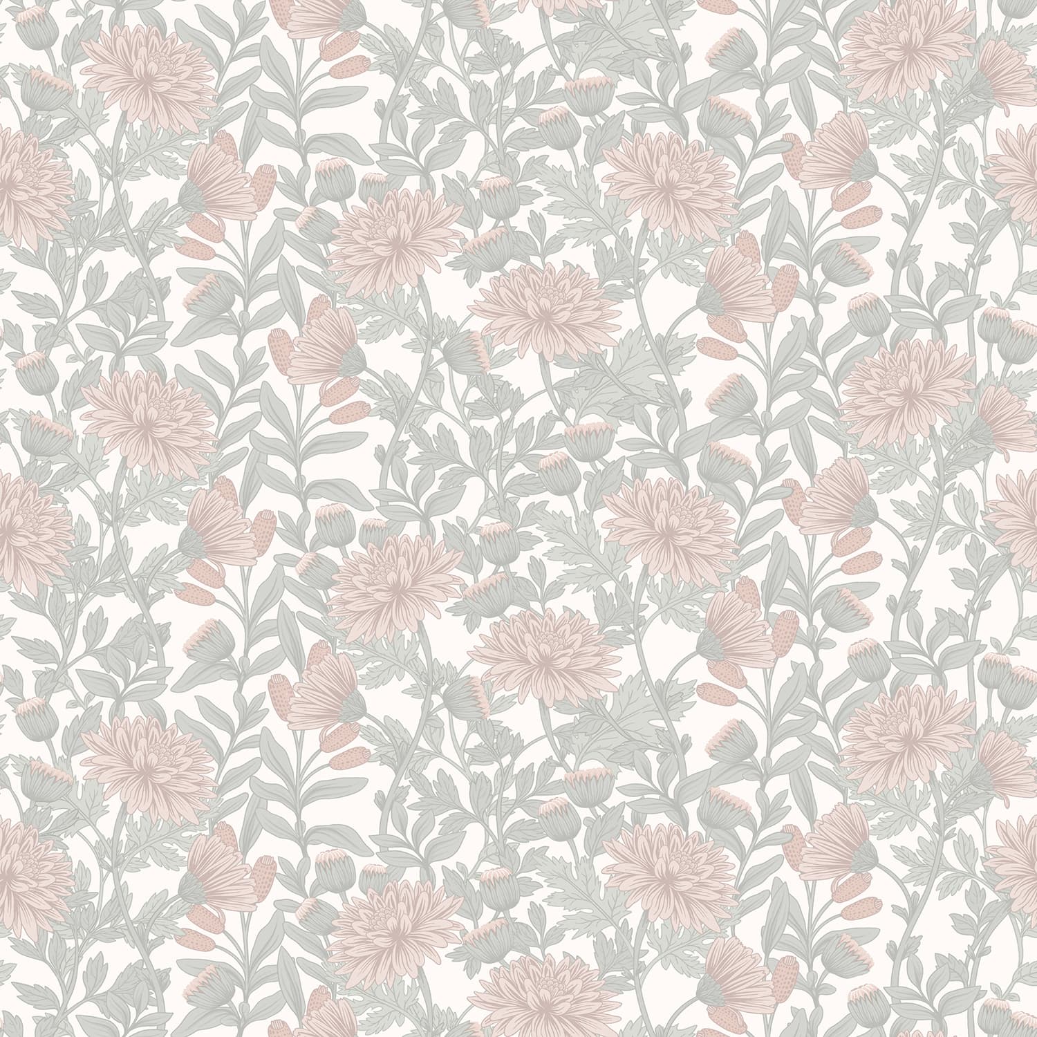 This floral Martha Wallpaper features chrysanthemum blooms and rounded buds intertwined with slender stems and gently layered leaves, creating a flowing and organic rhythm across the surface.