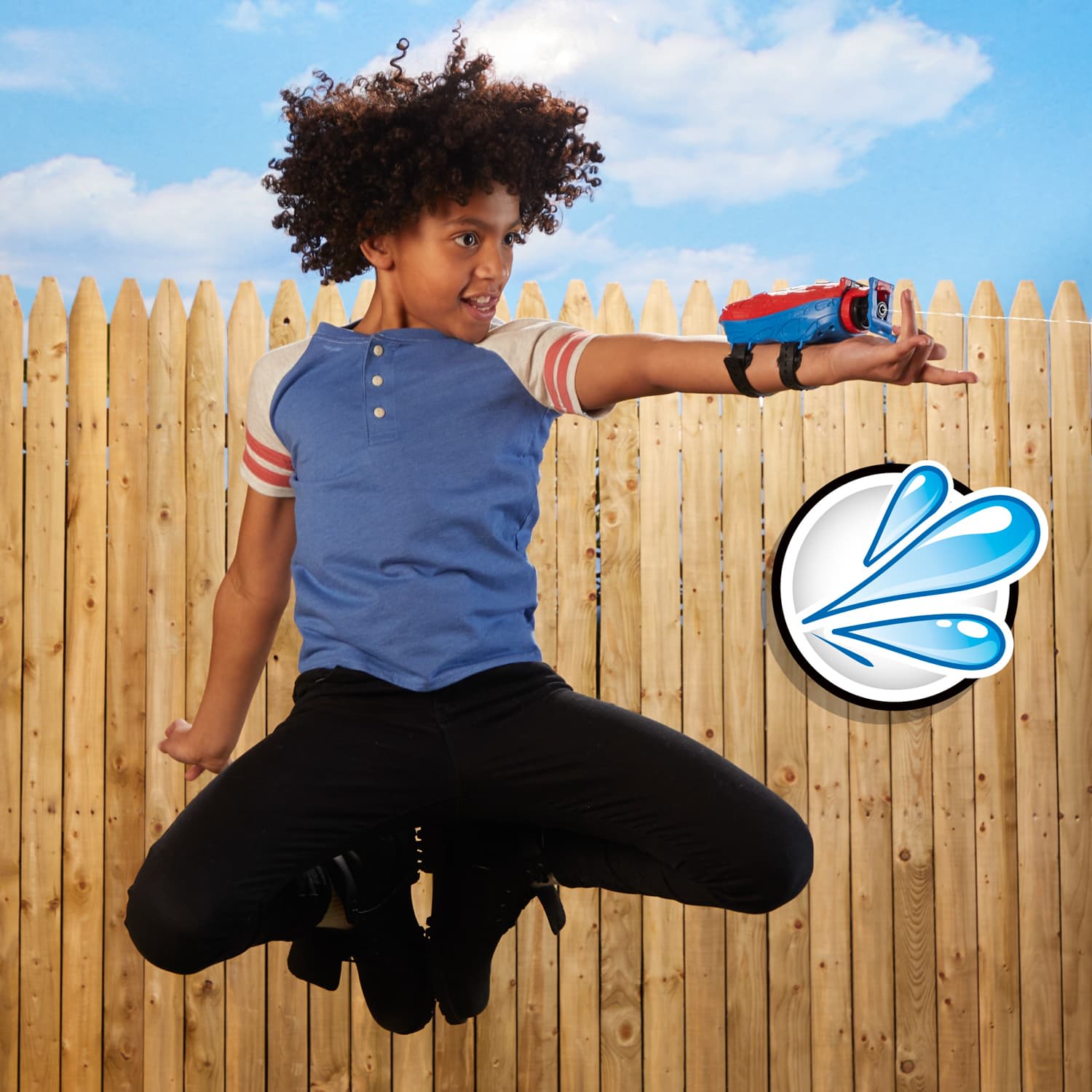 Blaster features 2 adjustable straps and comes with 1 Real Webs web fluid pouch (refills available. sold separately) and 1 reusable water pouch, so kids ages 5 and up can choose how they want to blast!