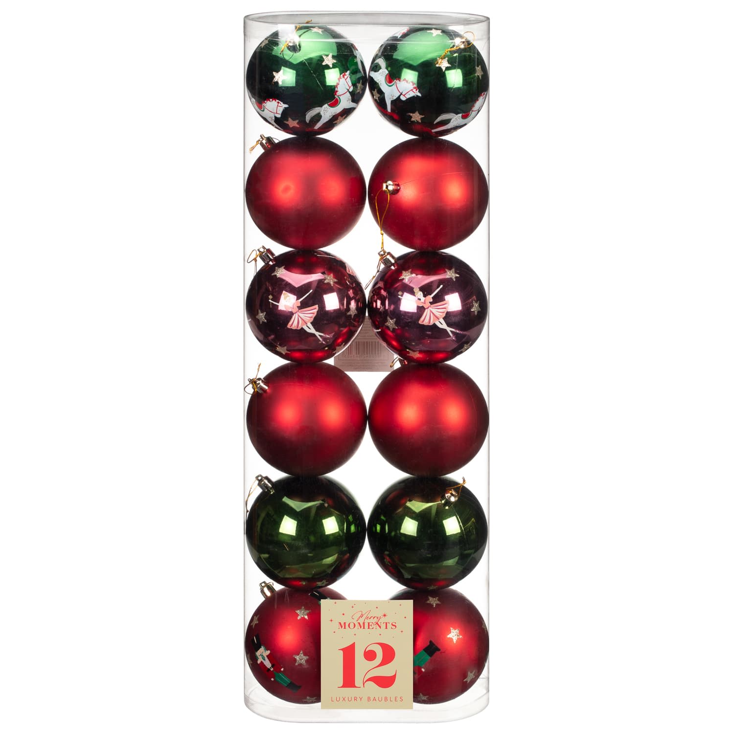 Includes 12 baubles in a range of shiny, matte, and glittery textures.