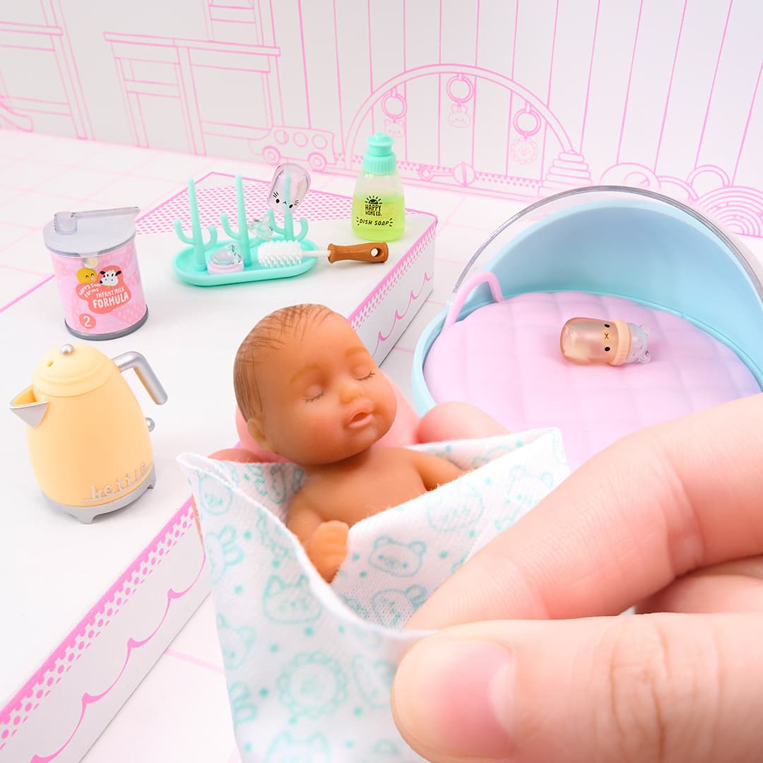Collect adorable, realistic mini babies, plus mini ingredients to make their baby food! From baby bottles, to mashed apple sauce, to sliced avocado and eggs, every mini moment is made to melt your heart.