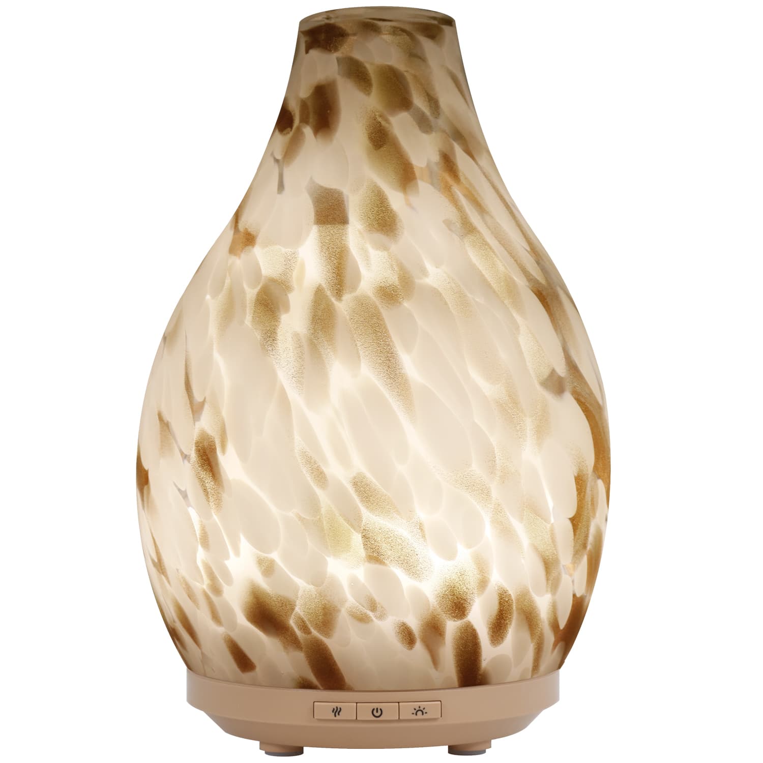 The diffuser showcases a captivating tortoise shell pattern with a golden shimmer on its glass cover, adding an elegant touch to its design. When in use, the diffuser emits a comforting warm white light that shines through the unique artwork, creating an inviting atmosphere that complements any space.