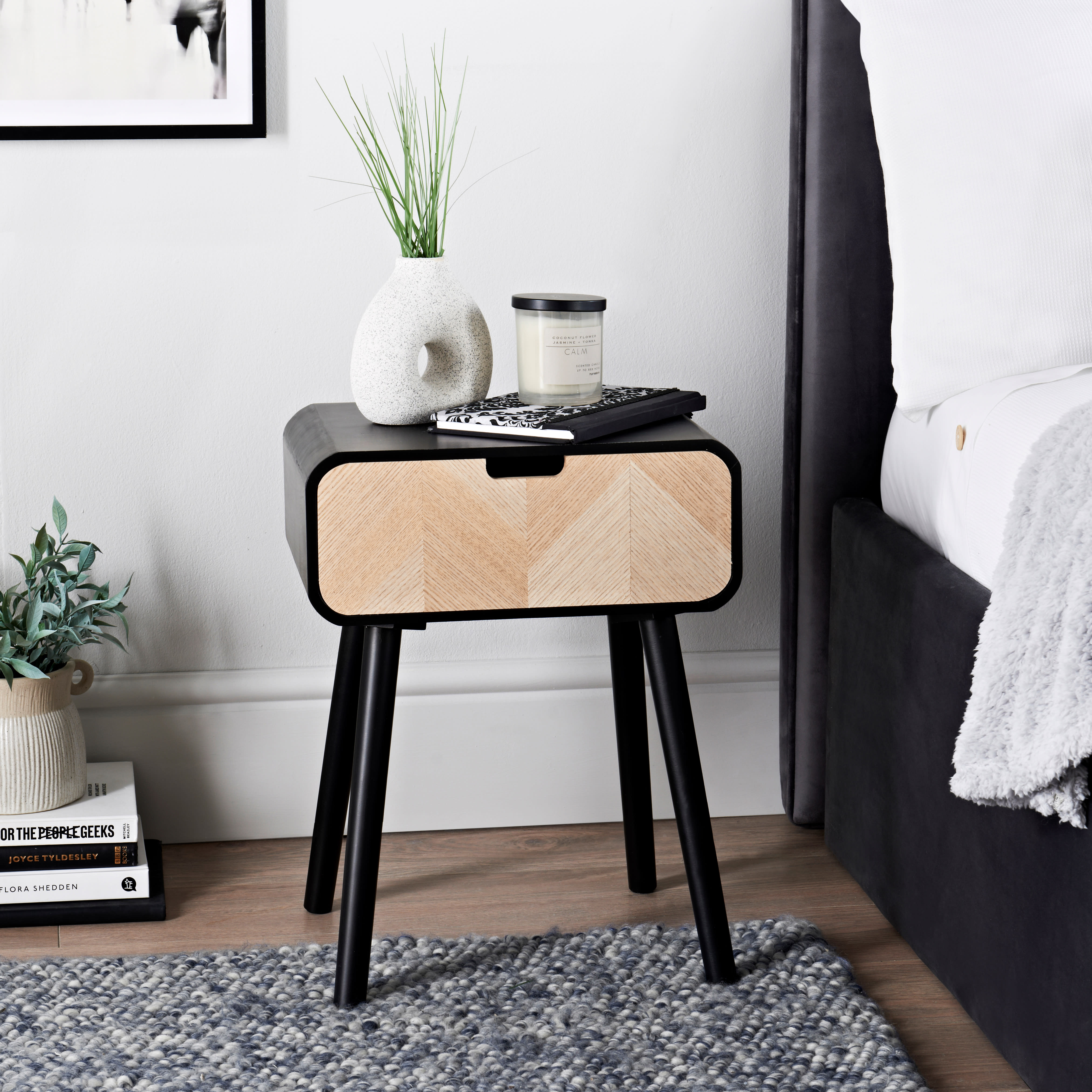 With a natural oak finish and black frame, this bedside table is a decorative compliment to both classic and contemporary interiors.