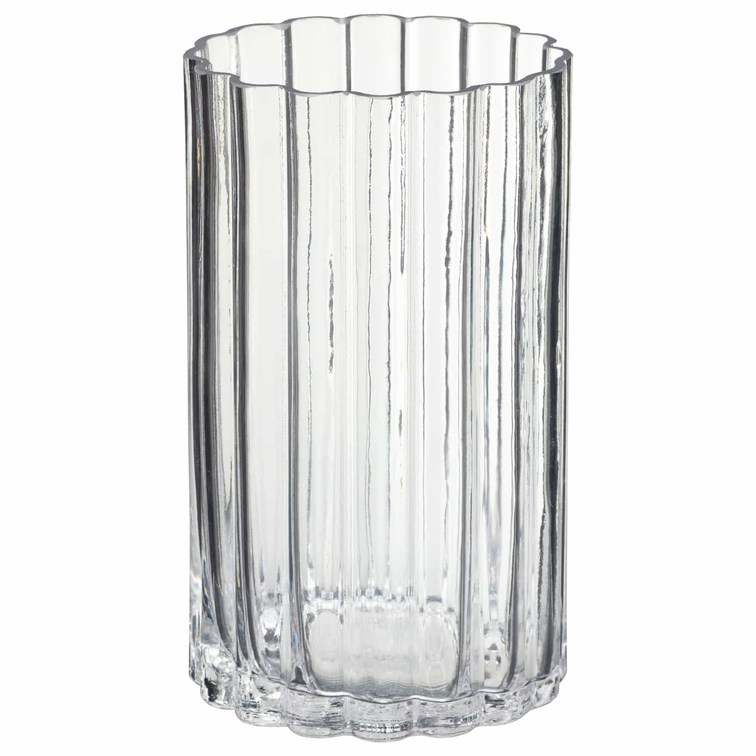 Decorate your home with this stylish, on trend, glass vase with scalloped rim.