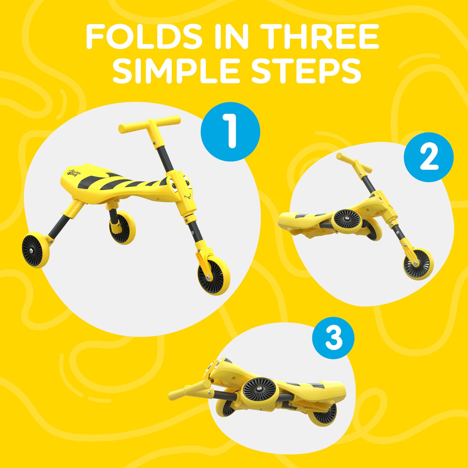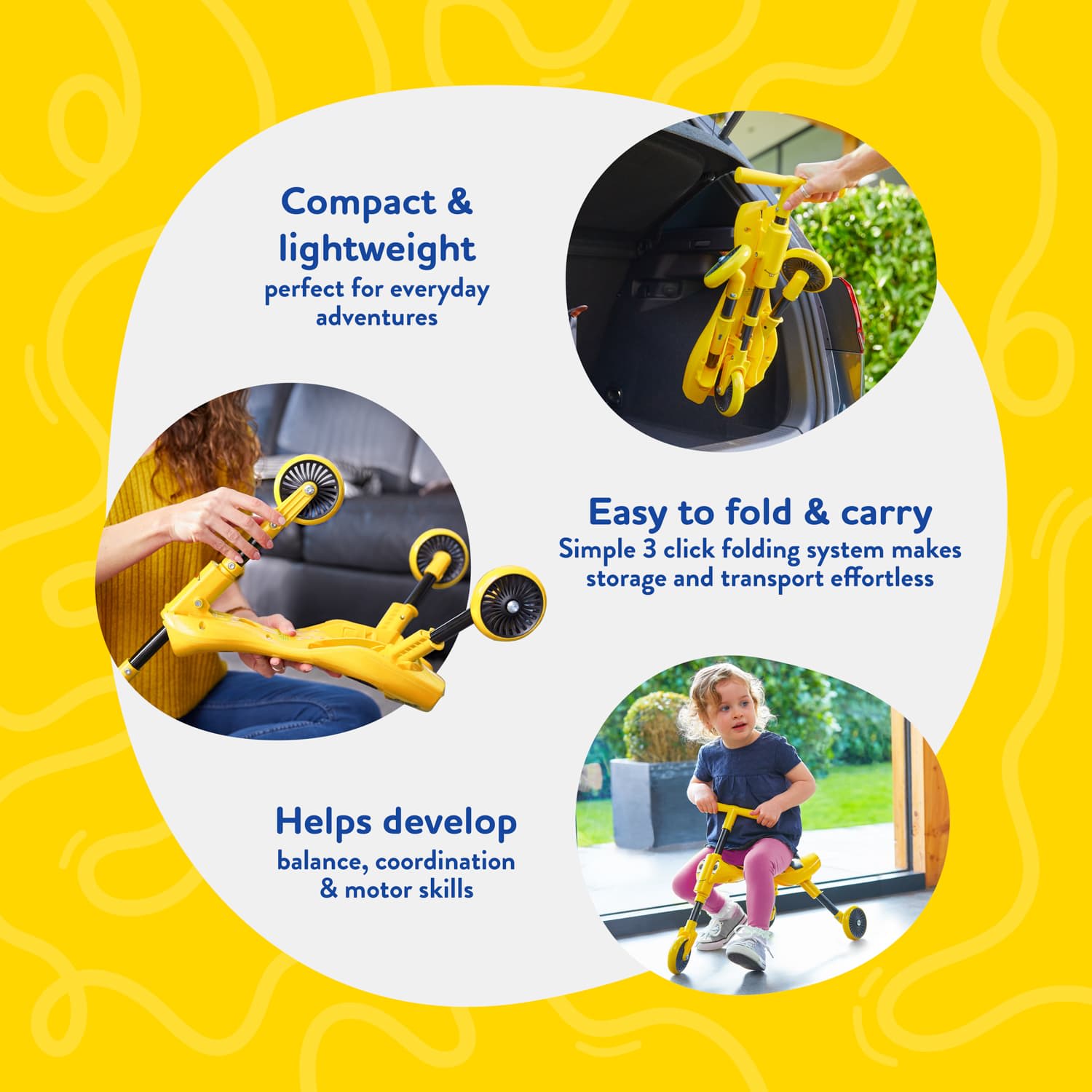 As well as being fun, bright and funky, they have front wheel steering for greater manoeuvrability and a clever - but simple - three-click folding system, making them portable, easy to store and practical for the modern family.
