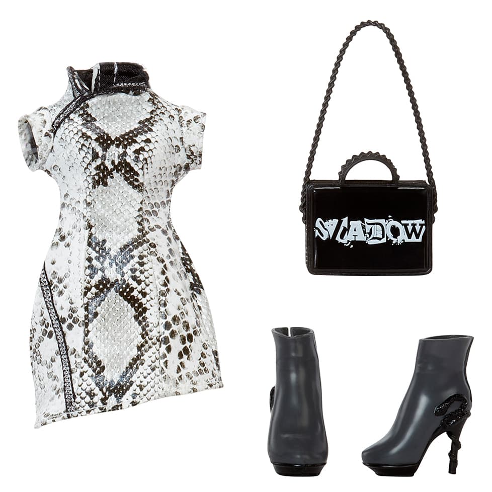 Meet Heather Grayson, striking in classic black and white, and featuring premium details, such as long, real eyelashes and glass-like eyes. Heather styles a chic outfit, stylish shoes, and a matching handbag.