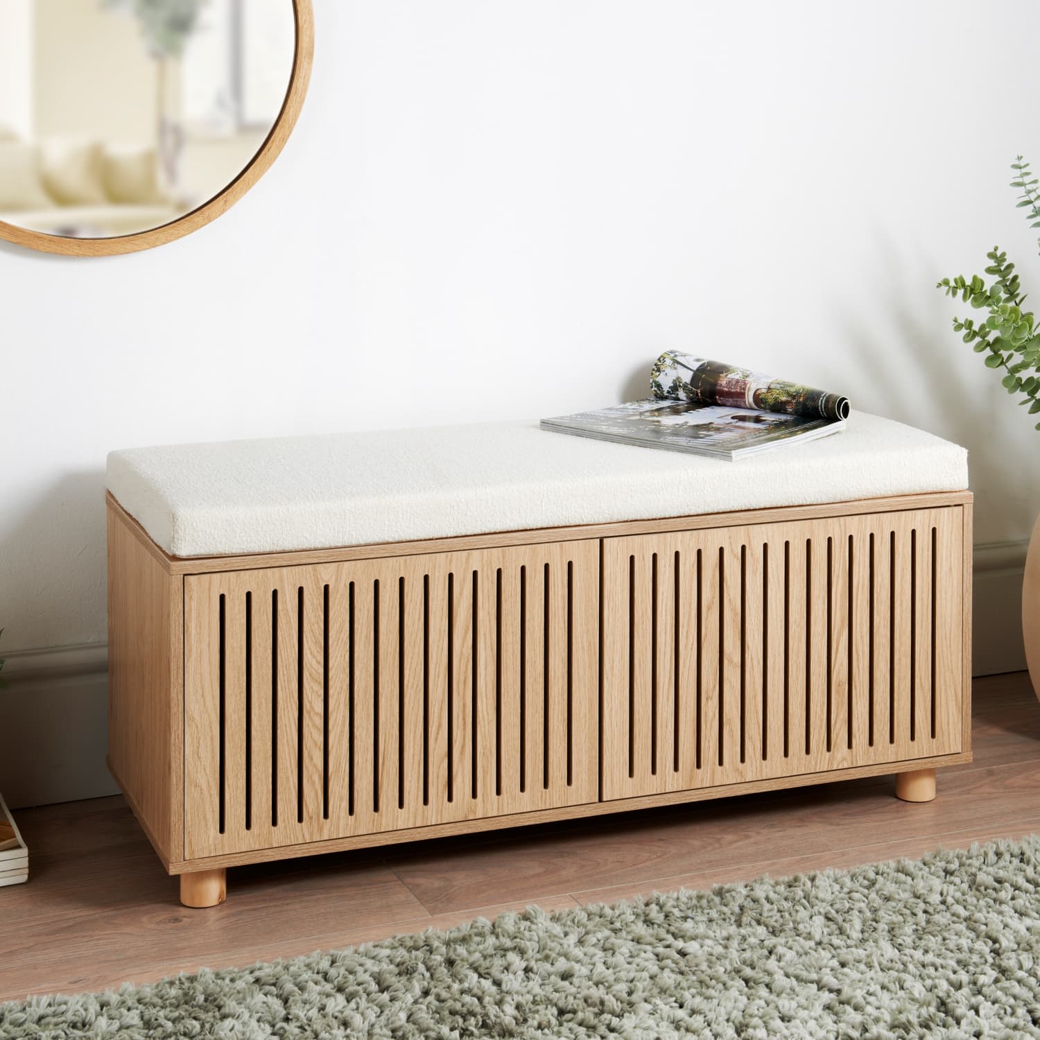 Blending natural warmth with practical design, this versatile bench offers comfortable seating on top and concealed storage below.