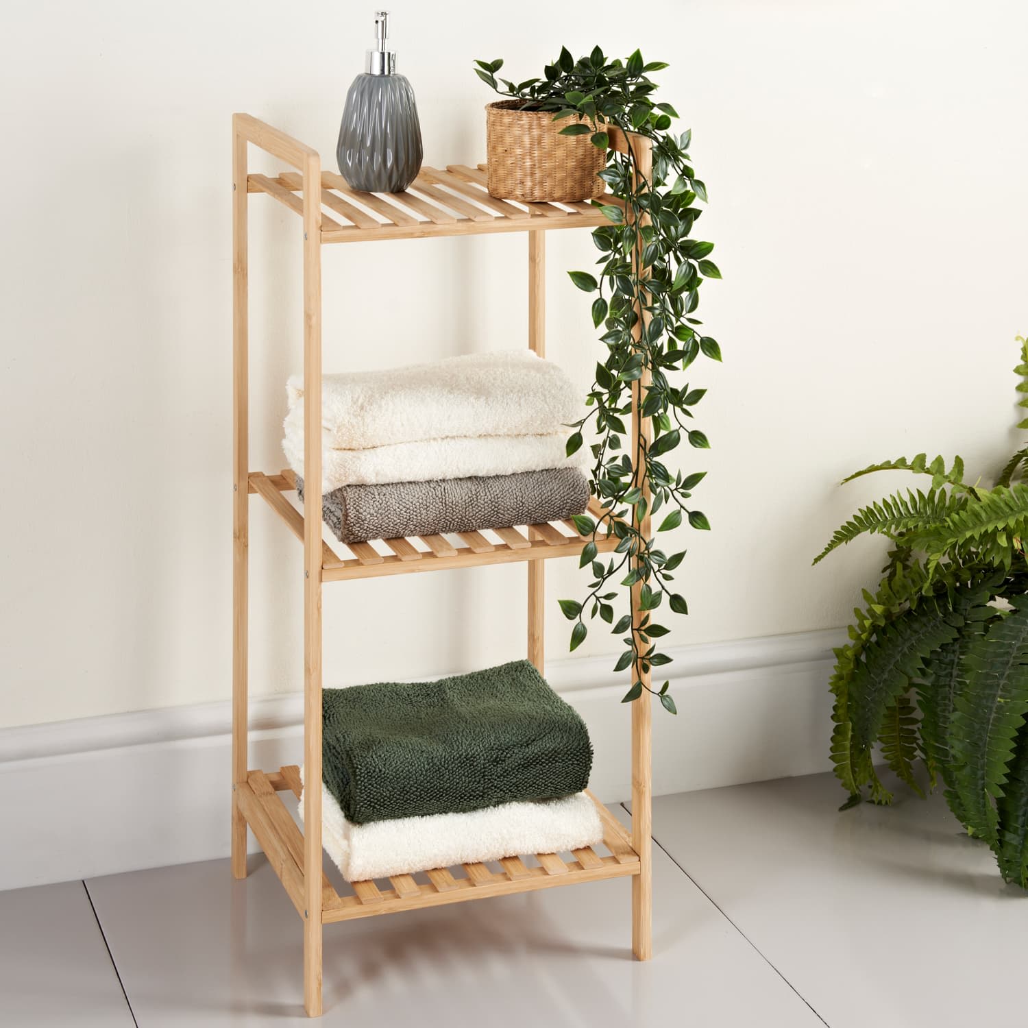Featuring a 3-tier design, this shelving unit comes with plenty of space for toiletries, towels, and faux plants to create a fresh, natural, and minimalist aesthetic.