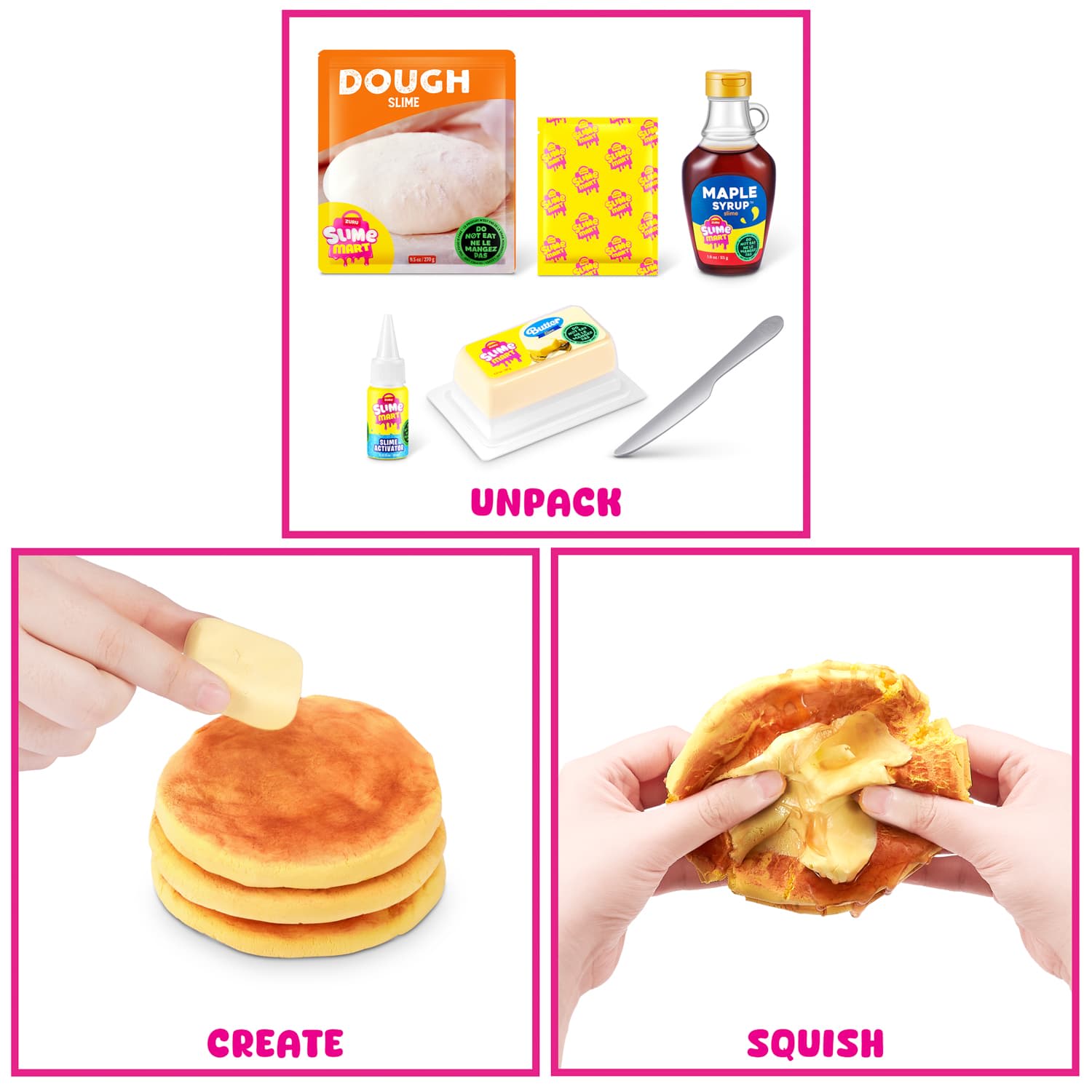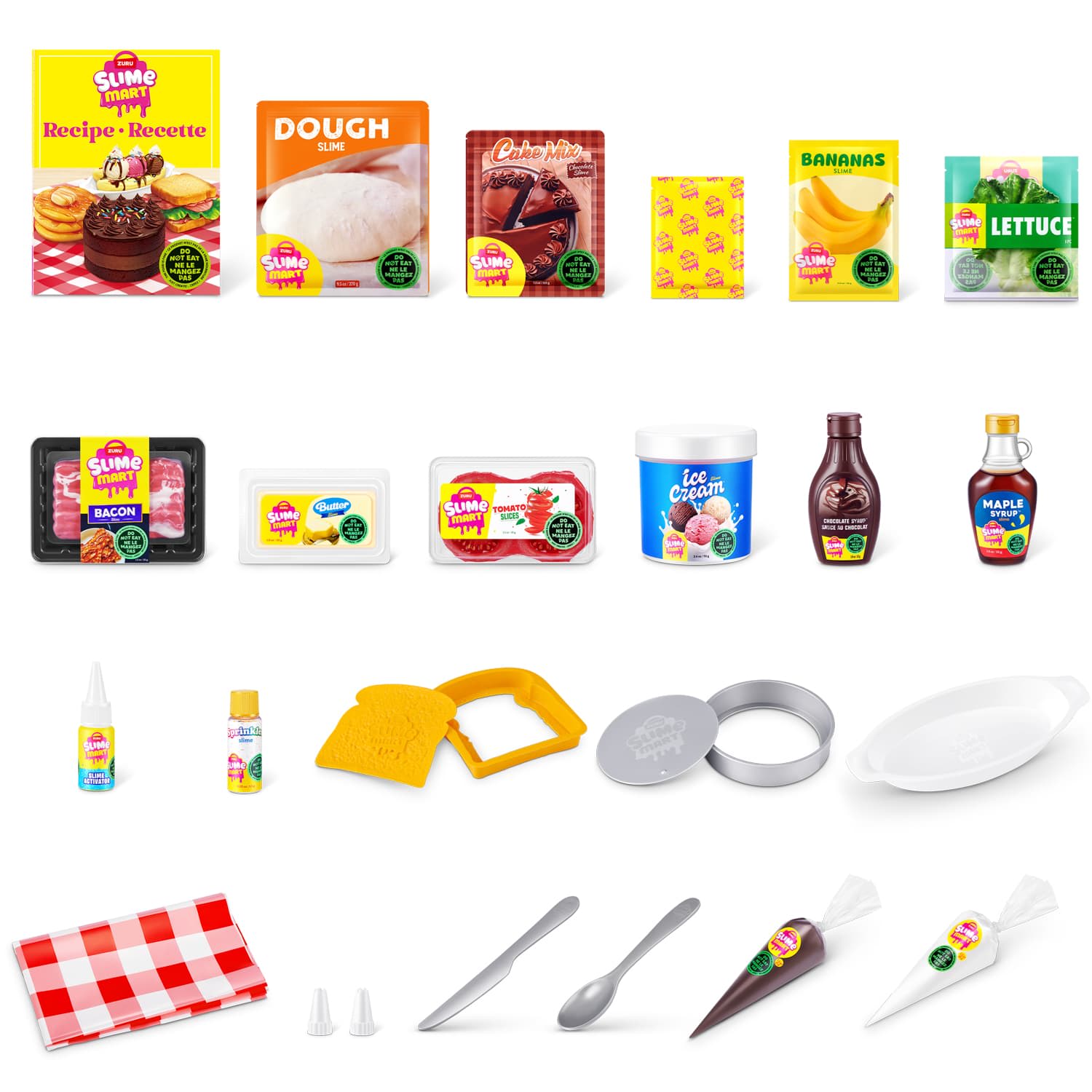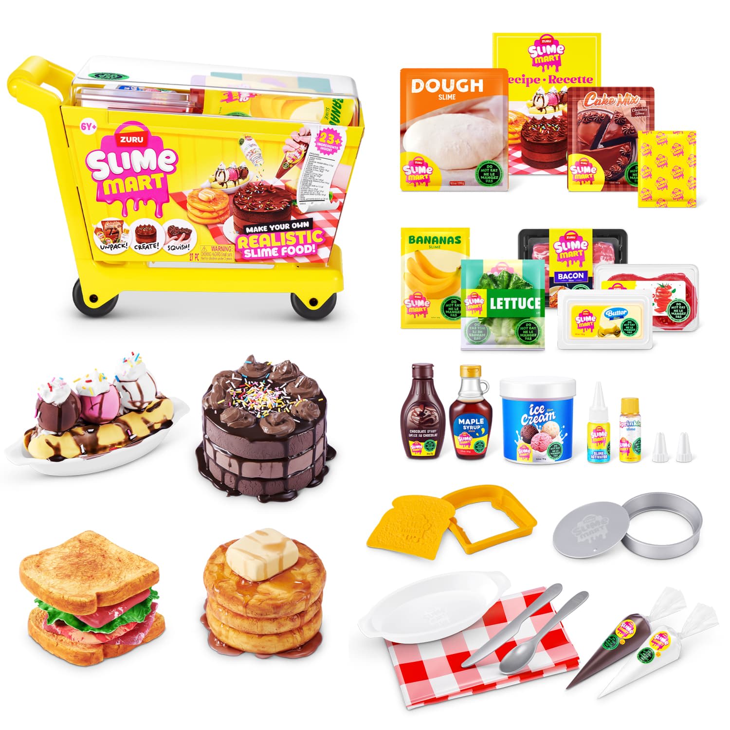 Includes: 1 x Slime Mart Trolley, 1 x Table Cloth, 1 x Slime Activator, 1 x Knife, 2 x Dough (140g), 1 x Charring Powder (3g), 1 x Brush, 1 x Maple Syrup Slime (60g), 1 x Butter Slime (35g), 1 x Bread Mould, 1 x Bacon Pack Slime (40g), 1 x Plastic Lettuce, 1 x Tomato Pack Slime (40g), 1 x Cake Mix (150g), 1 x Icing (cream) Slime (50g), 1 x Piping Tip, 1 x Sprinkles (1.5g), 1 x Cake Tin, 1 x Banana Slime (30g), 1 x Whipping Cream Slime (50g), 3 x Ice Cram Slime (80g), 1 x Chocolate Syrup Slime (60g), 1 x Bowl & Spoon Set