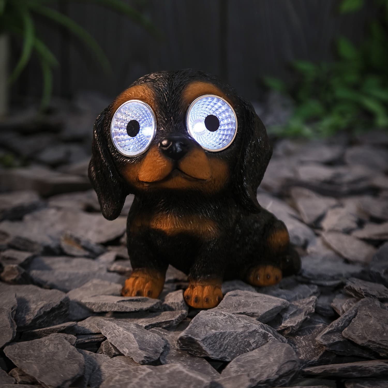 Add a cute, decorative lighting piece to your garden with this big eyed dog.