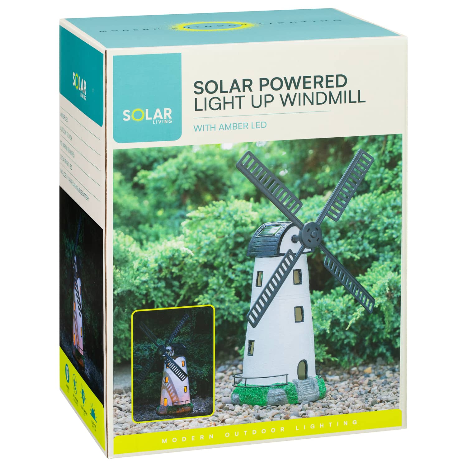 The solar powered windmill automatically switches on at dusk. It requires no wiring and provides an ambient glow at night time in your garden.