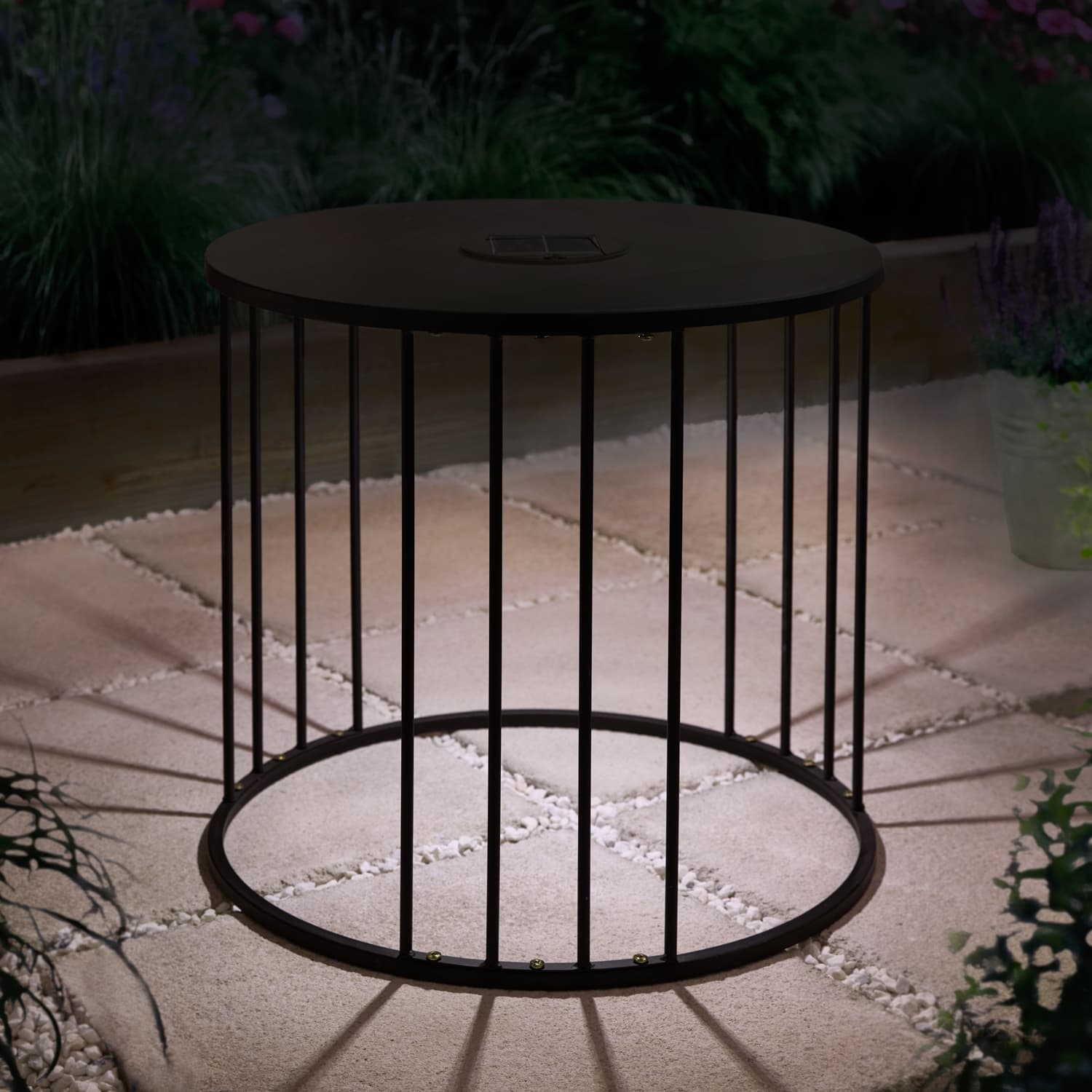 A stylish metal table that provides ambient solar lighting at night.