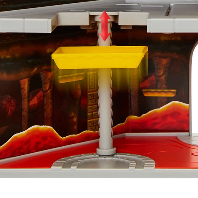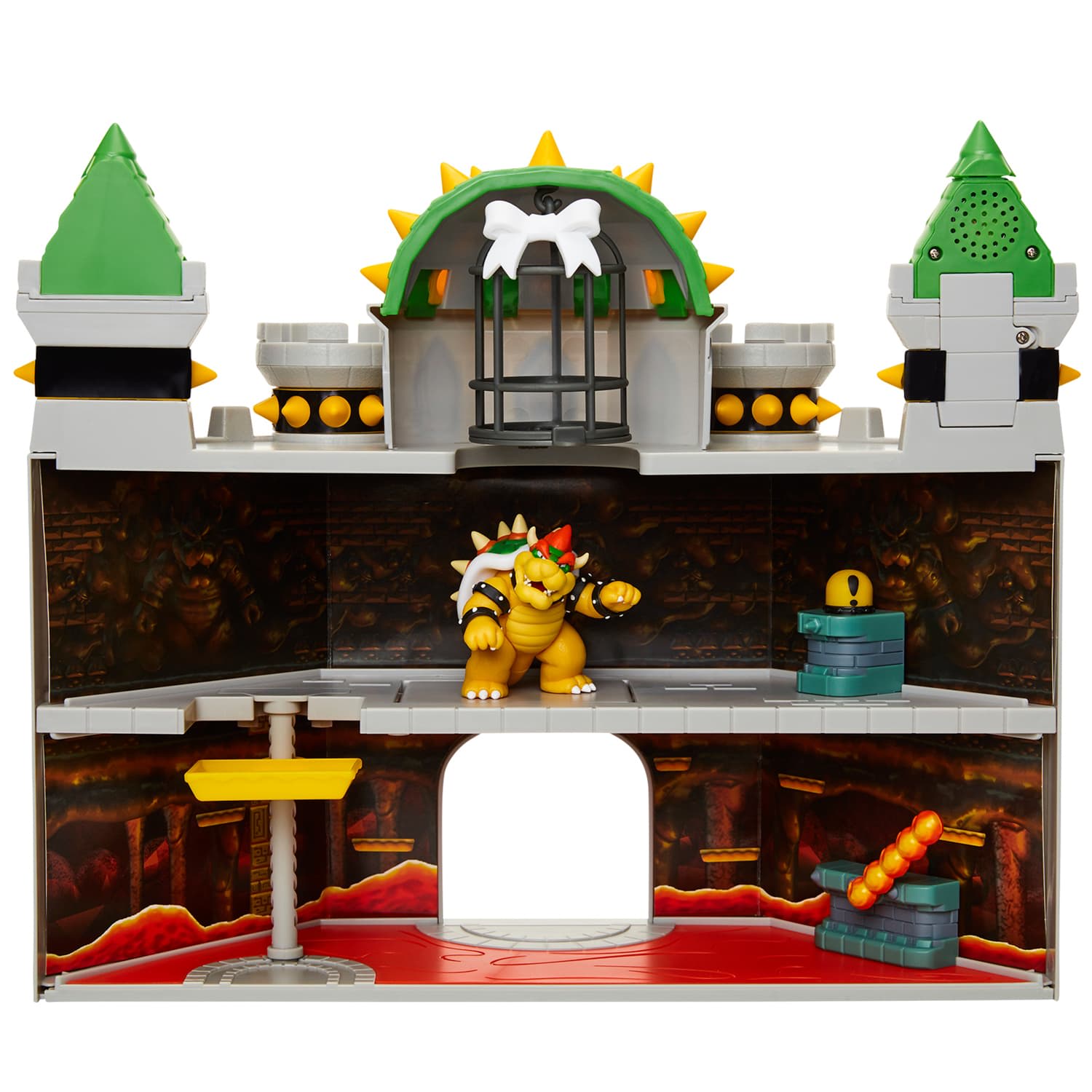 Kids can raise and lower the lift, spin the fireballs, open the cage, and trigger the trap door to drop Browser into the lava below. Press the castle spire and activate in-game sounds and music for an immersive experience.
